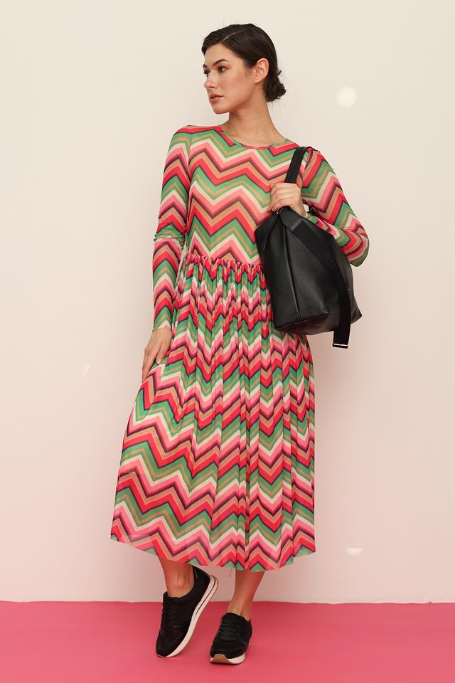 Платье имеет приталенный силуэт, который подчеркивает фигуру, и длинные рукава. Особое внимание привлекает яркий узор в полоску, выполненный в сочетании красного, розового и зеленого цветов. Юбка-плиссе придает платью легкость и динамичность.