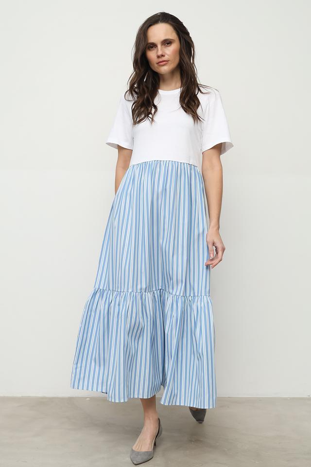 Платье Rich and Royal голубого цвета с белым верхом выполнено в полоску и имеет многоярусную юбку. Модель из 100% хлопка обеспечит комфорт и лёгкость в носке. Состав: хлопок 100%