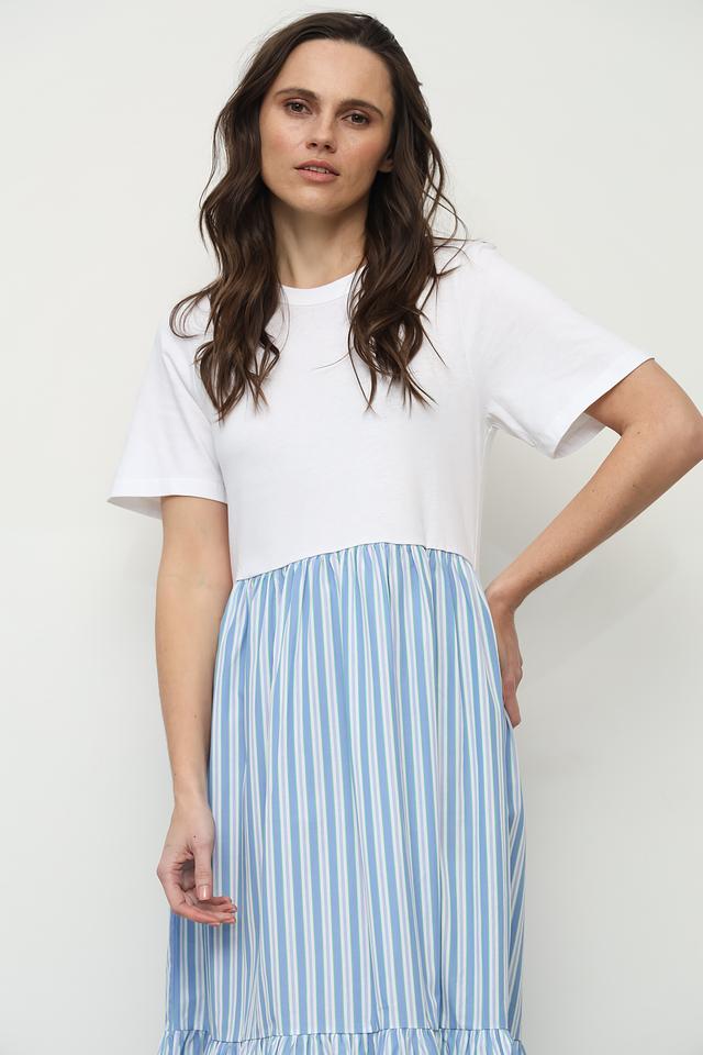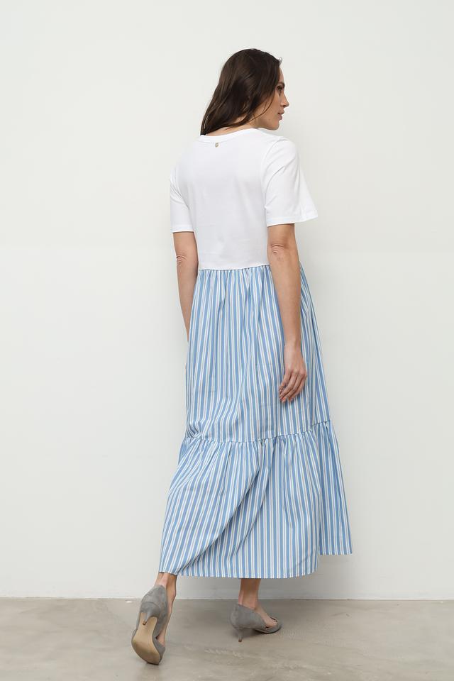 Это стильное платье от Rich and Royal сочетает в себе удобство и актуальный дизайн. Верх платья выполнен из белого хлопка, а юбка – из ткани в голубую полоску.