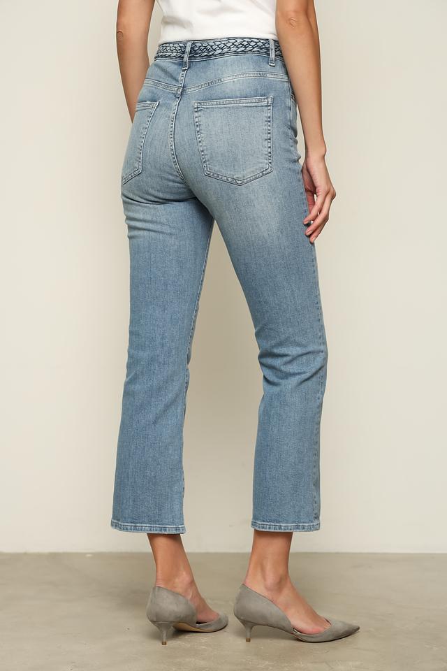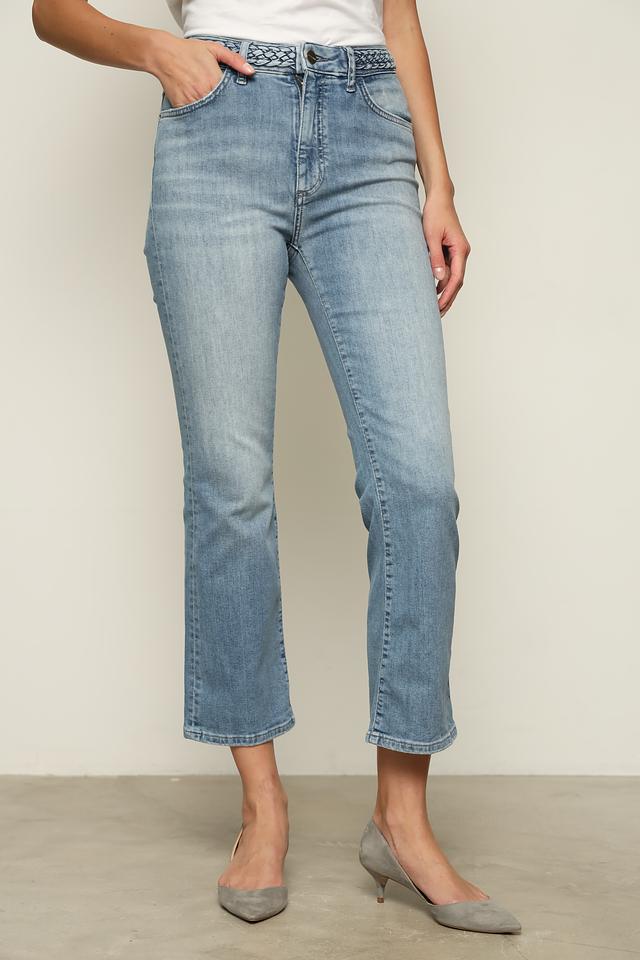 Джинсы имеют высокую посадку, которая подчеркивает талию и визуально удлиняет ноги. Укороченный прямой силуэт делает их актуальными и современными. Ткань состоит из 97% хлопка и 3% эластана, что обеспечивает мягкость, приятные тактильные ощущения и небольшую эластичность.