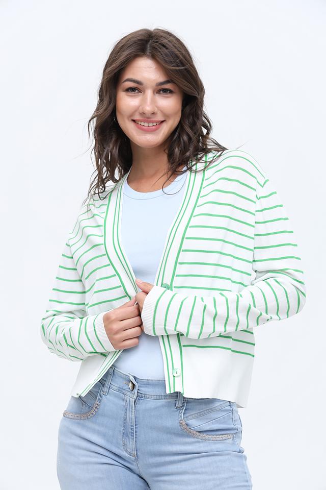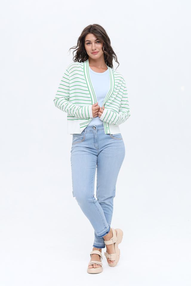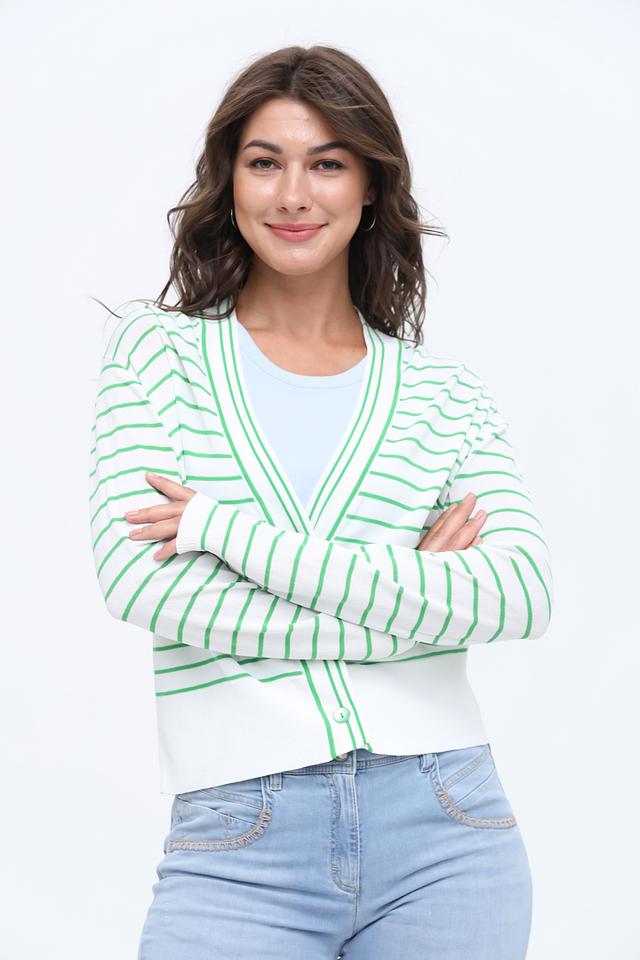Женский кардиган Rich and Royal белого цвета с зелёной полоской – стильная и удобная модель с длинными рукавами и застёжкой на пуговицы. Идеально дополнит повседневный образ, придавая ему лёгкость и свежесть. Состав: вискоза 65%, полиамид 35%
