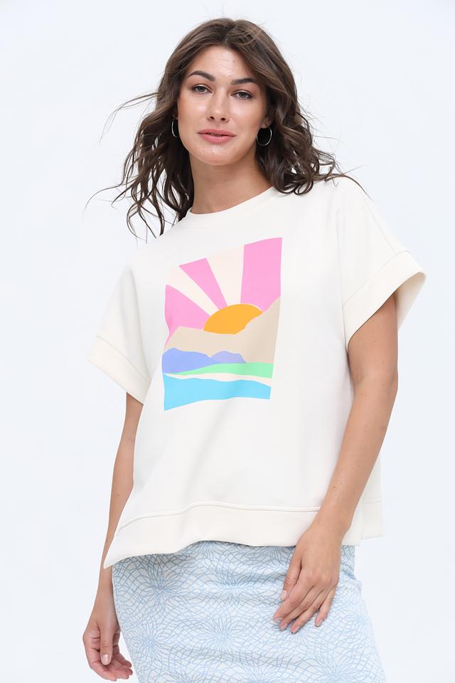 Эта стильная футболка от Rich and Royal станет отличным дополнением к вашему гардеробу. Она выполнена в кремовом цвете и украшена оригинальным принтом, изображающим восход солнца в пастельных тонах.