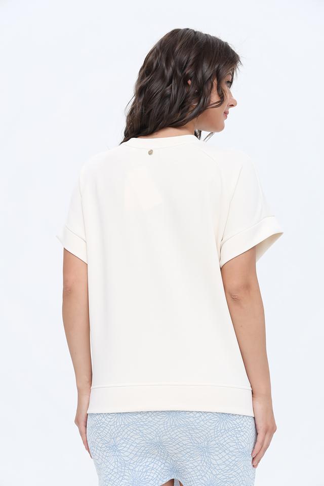 Футболка имеет свободный крой и короткие рукава с манжетами, что обеспечивает комфорт в носке. Модель изготовлена из высококачественного модала, полиэстера и эластана, которые приятны к телу и хорошо держат форму.