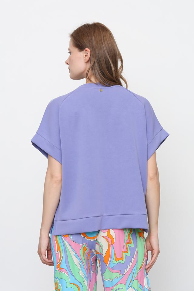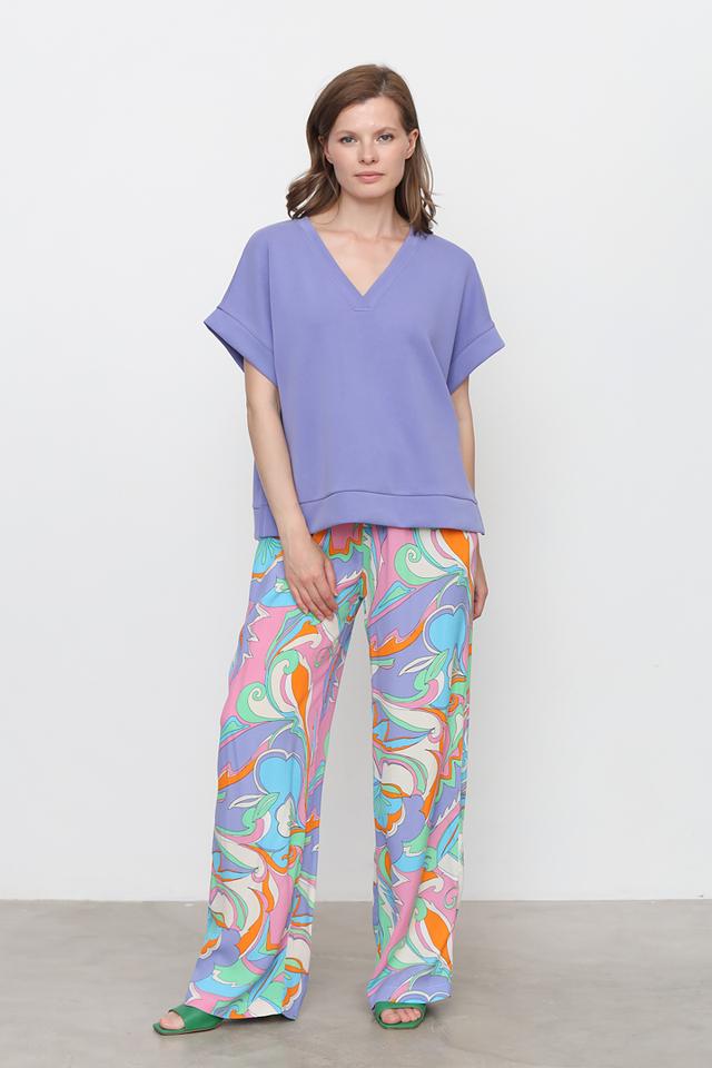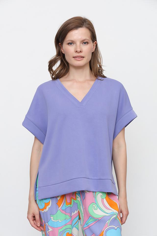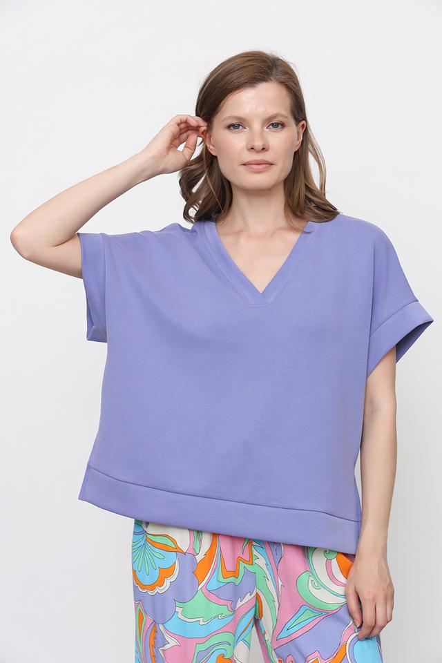 Футболка имеет лаконичный дизайн с V-образным вырезом и короткими рукавами. Она идеально подходит для создания повседневных образов. Лиловый цвет придает ей особую изысканность и женственность.