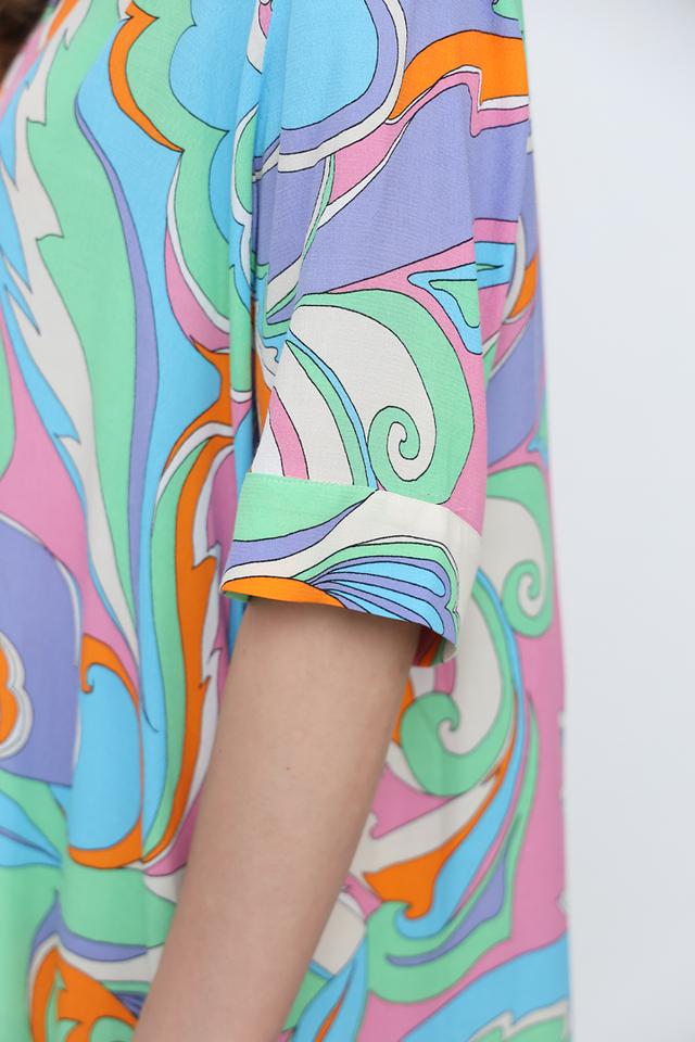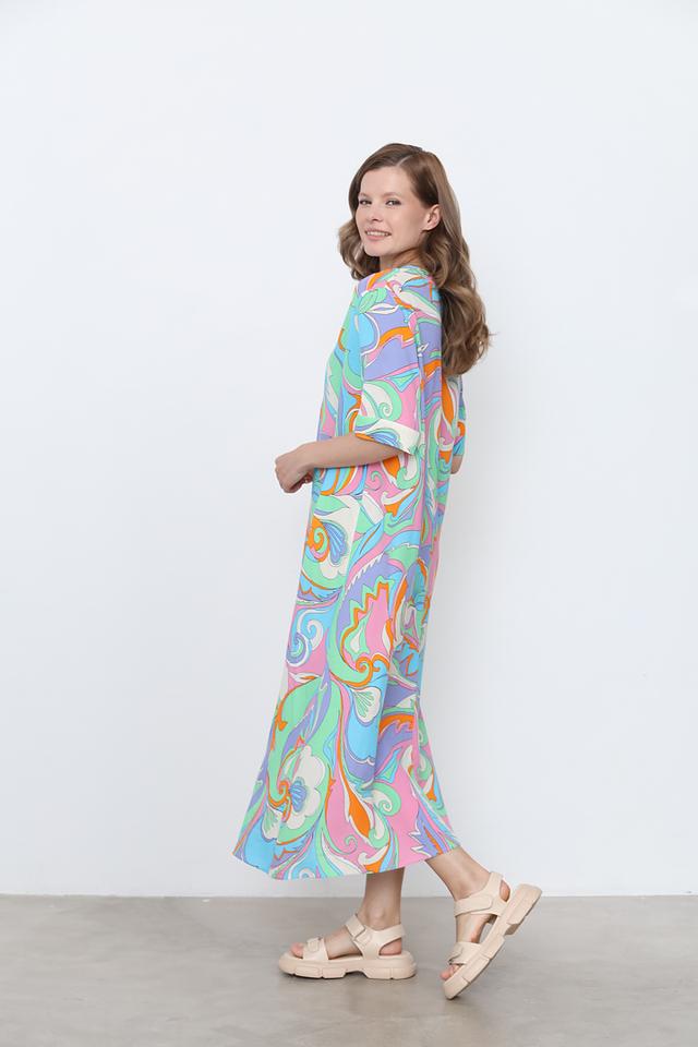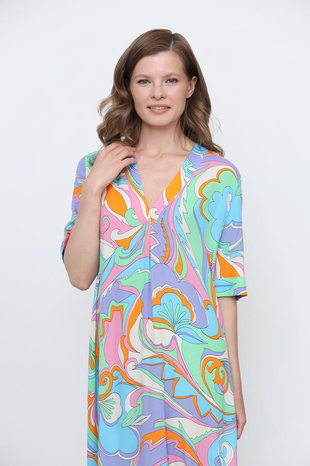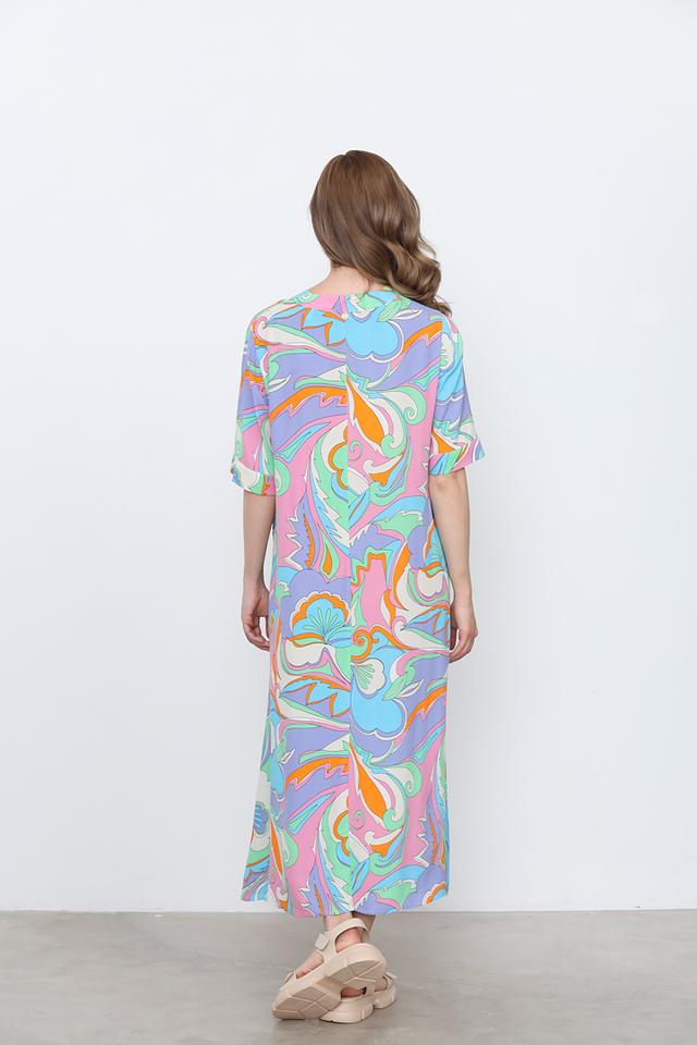 Платье имеет свободный крой, который не сковывает движения, и короткие рукава, идеально подходящие для теплой погоды. V-образный вырез горловины добавляет образу женственности. Особенностью платья является его уникальный, яркий принт, выполненный в разнообразных цветах.