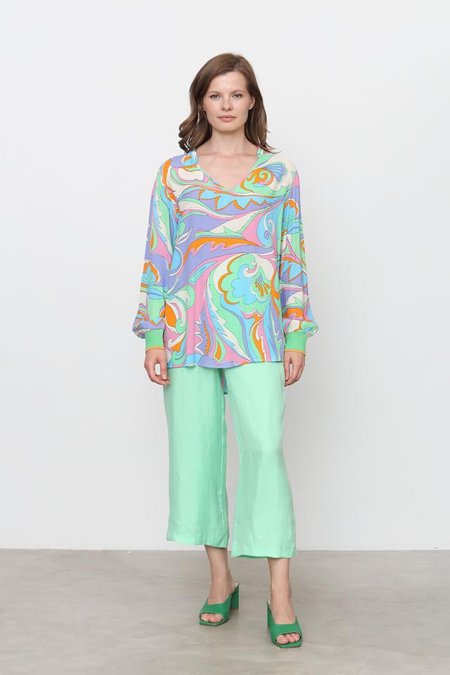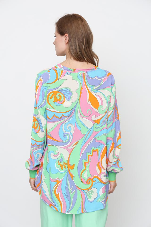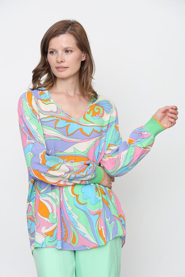 Особенностью этой блузы является ее уникальный принт – яркий и красочный абстрактный узор, выполненный в различных оттенках. Эта блуза идеально подойдет для создания стильного и запоминающегося образа, который подчеркнет вашу индивидуальность.
