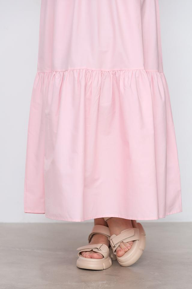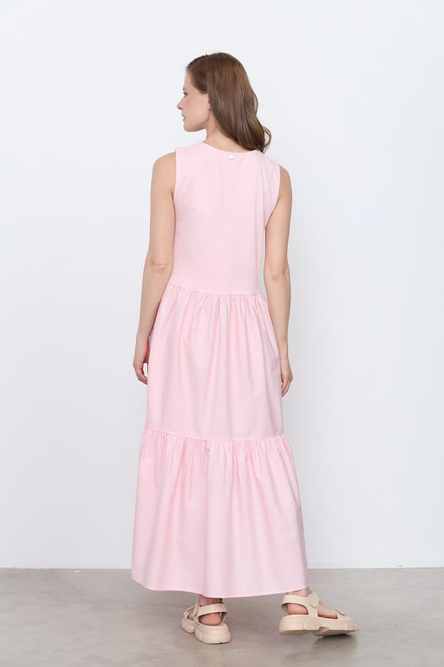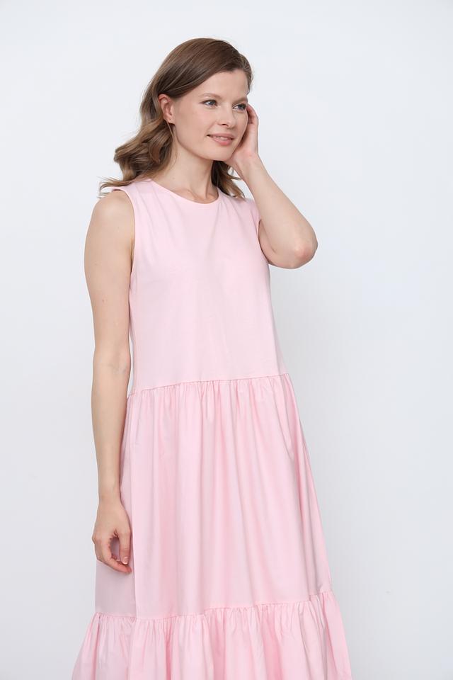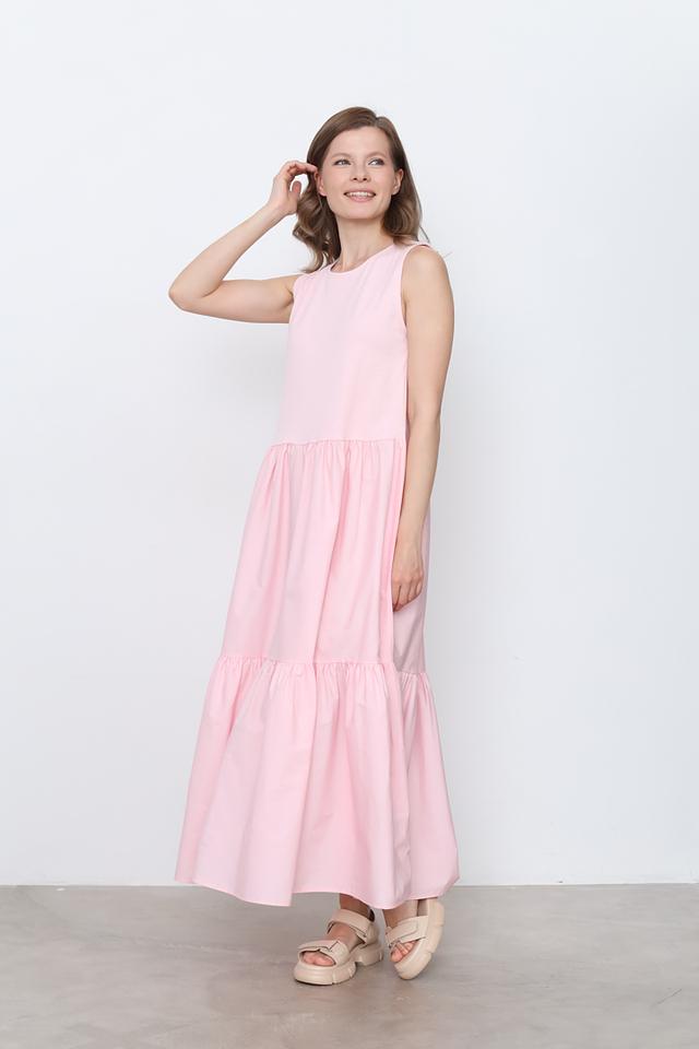 Модель отличается длиной миди и отсутствием рукавов, что делает ее идеальным выбором для теплой погоды. Многослойная юбка придает платью объем и легкость. Круглый вырез горловины лаконично дополняет образ.