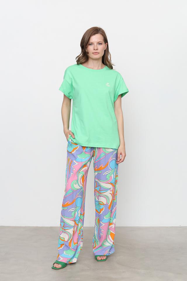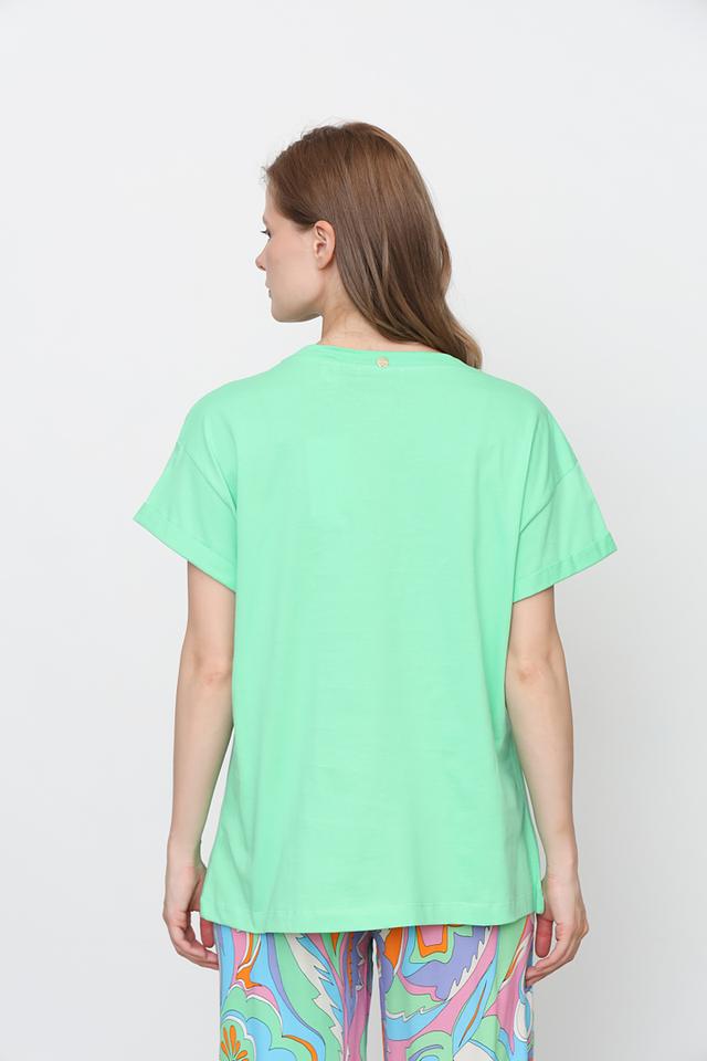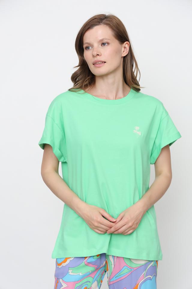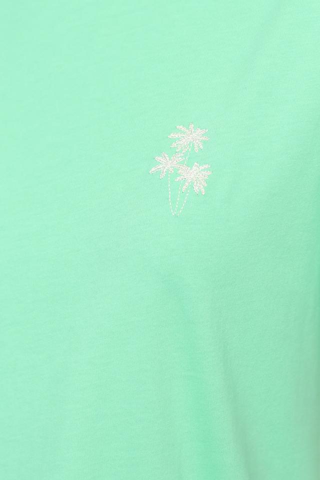 Особый акцент в дизайне – небольшая вышивка с изображением пальм на груди, которая добавляет футболке оригинальности и подчеркивает ее стиль. Цвет футболки – нежный мятный, который легко сочетается с другими элементами одежды.