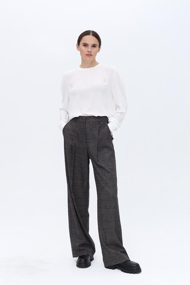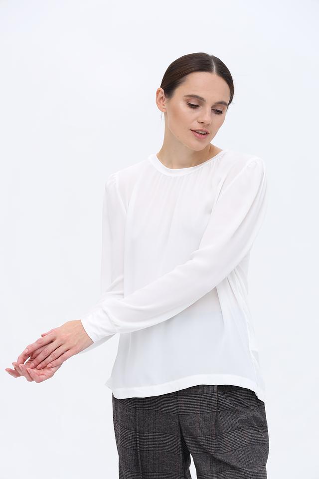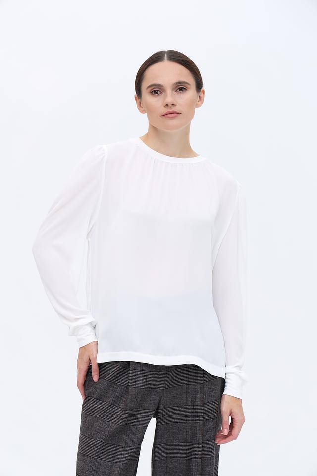 Блуза имеет прямой крой, длинные рукава с манжетами и небольшой сборкой у плеч, формирующей эффектные рукава-фонарики. Округлый вырез горловины добавляет женственности.
