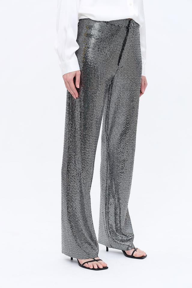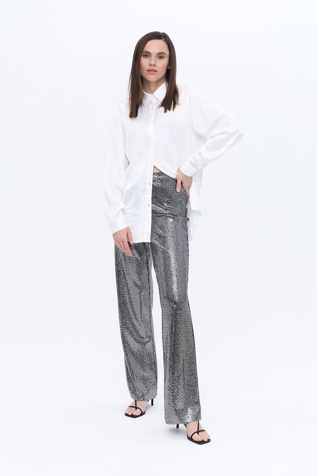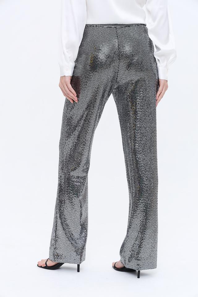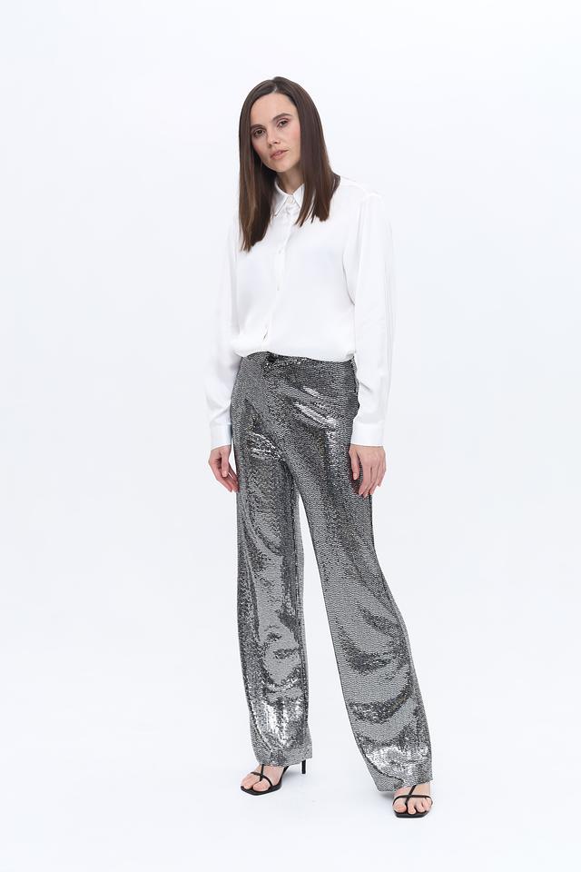 Благодаря пайеткам, брюки идеально подходят для вечерних мероприятий, вечеринок или особых случаев. Их можно сочетать с однотонными топами, блузками или жакетами, чтобы создать стильный и запоминающийся образ. Состав ткани: полиамид 86%, метализ.нить 9%, эластан 5%.