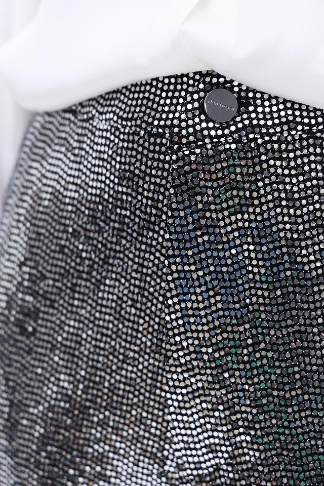 Брюки изготовлены из полиамида с добавлением металлизированной нити и эластана, что обеспечивает им прочность, износостойкость и небольшую эластичность. Высокая посадка визуально удлиняет ноги и подчеркивает талию, а широкий крой создает элегантный и женственный силуэт.