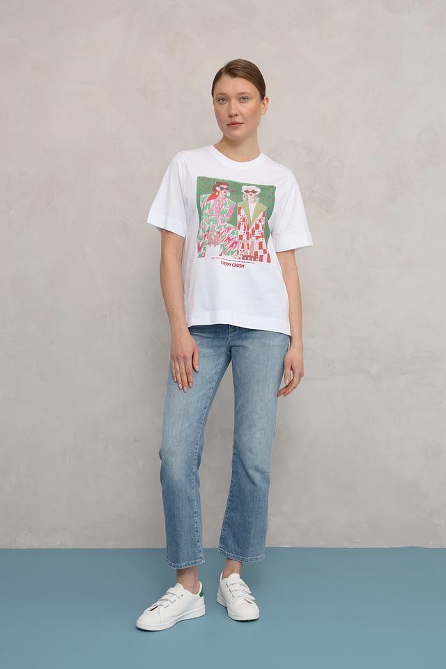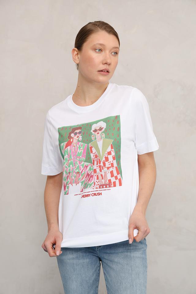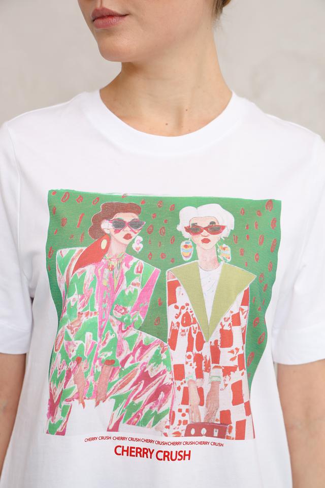 Основным акцентом футболки является яркий и запоминающийся принт "Cherry Crush", изображающий стилизованных девушек в ярких нарядах на фоне зелёного фона. Принт выполнен в насыщенных розовых, красных и зелёных тонах, что делает футболку особенно привлекательной.