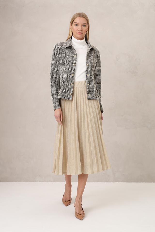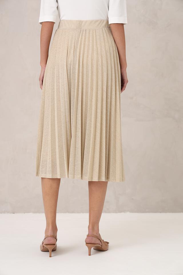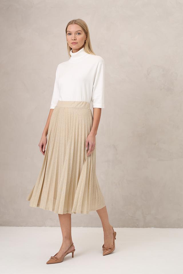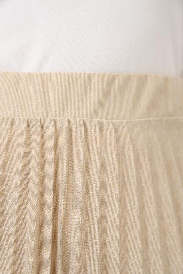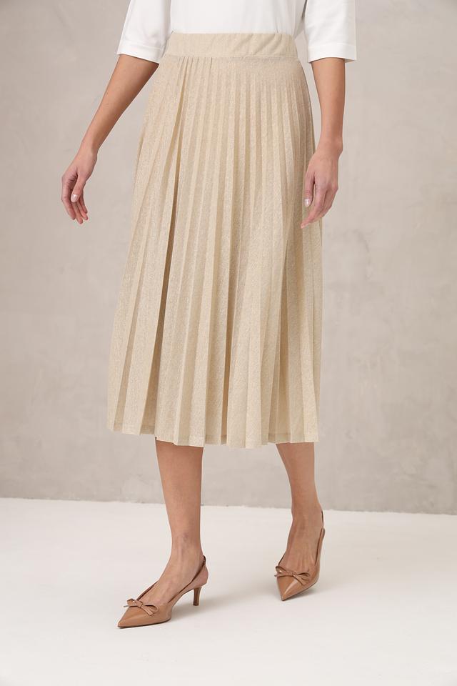 Юбка Rich and Royal золотистого цвета – это элегантная модель плиссированного кроя. Изготовлена из высококачественного полиэстера с добавлением металлизированной нити, что придает ей благородный блеск и изысканный вид. Идеально подойдет для создания вечерних и праздничных образов. Состав: полиэстер 61%, полиамид 17%, метализ.нить 17%, эластан 5%