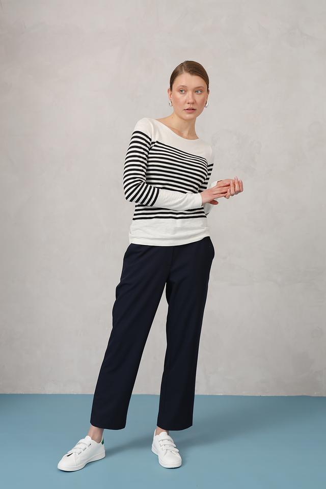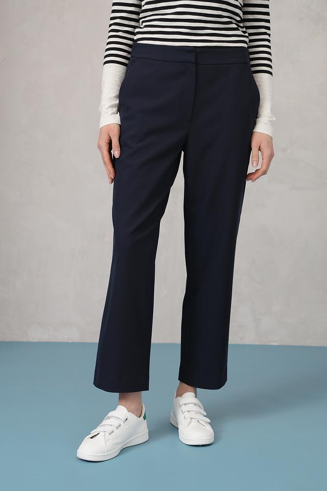 Брюки имеют стандартную посадку, прямой крой и длину до щиколотки, что делает их актуальными и современными. Застежка на молнию и пуговицу обеспечивает надежную фиксацию. Модель дополнена функциональными карманами по бокам.