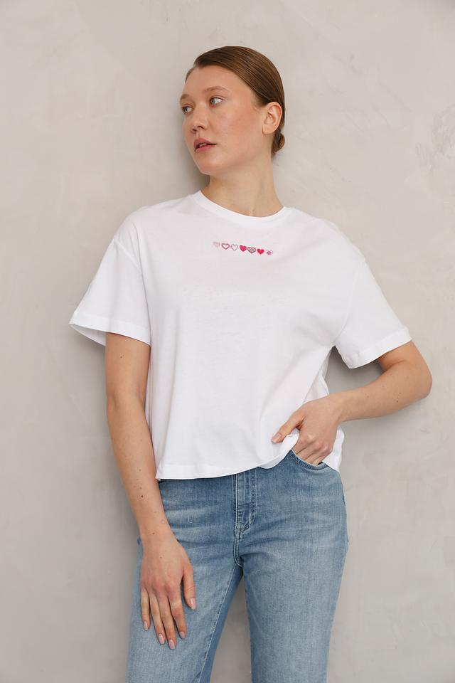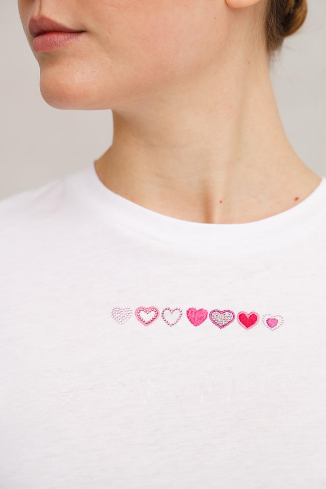 Особенностью данной модели является нежный принт в виде ряда розовых сердечек, расположенных на груди. Этот деликатный декор придает футболке романтичное и женственное настроение.