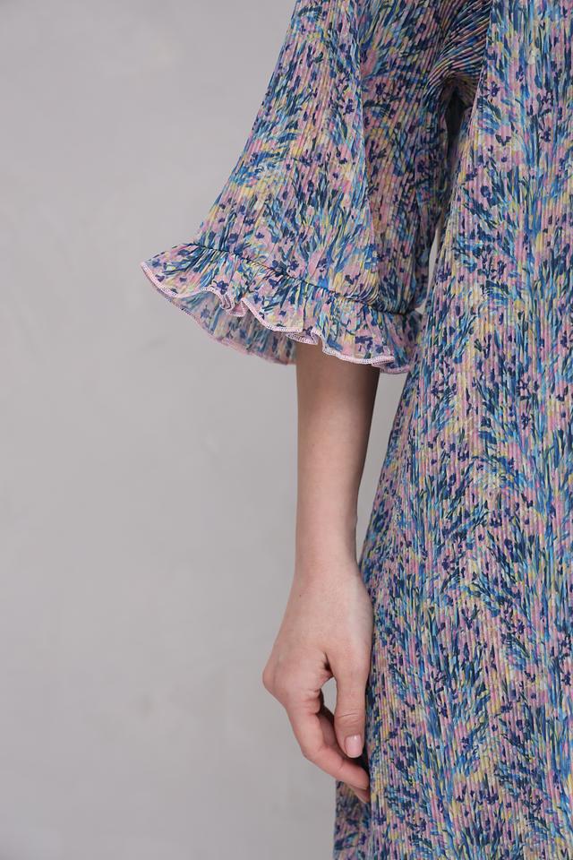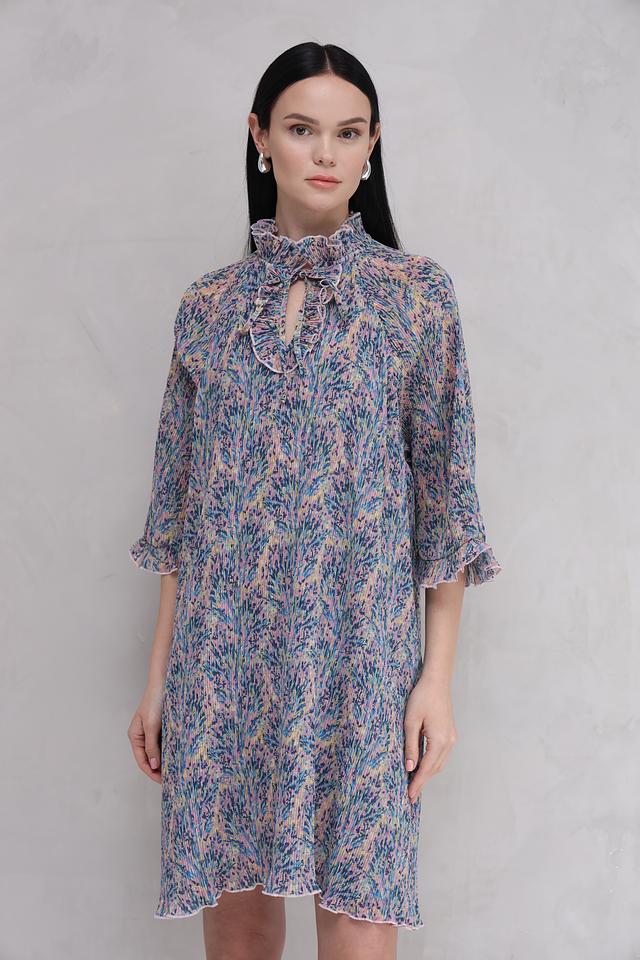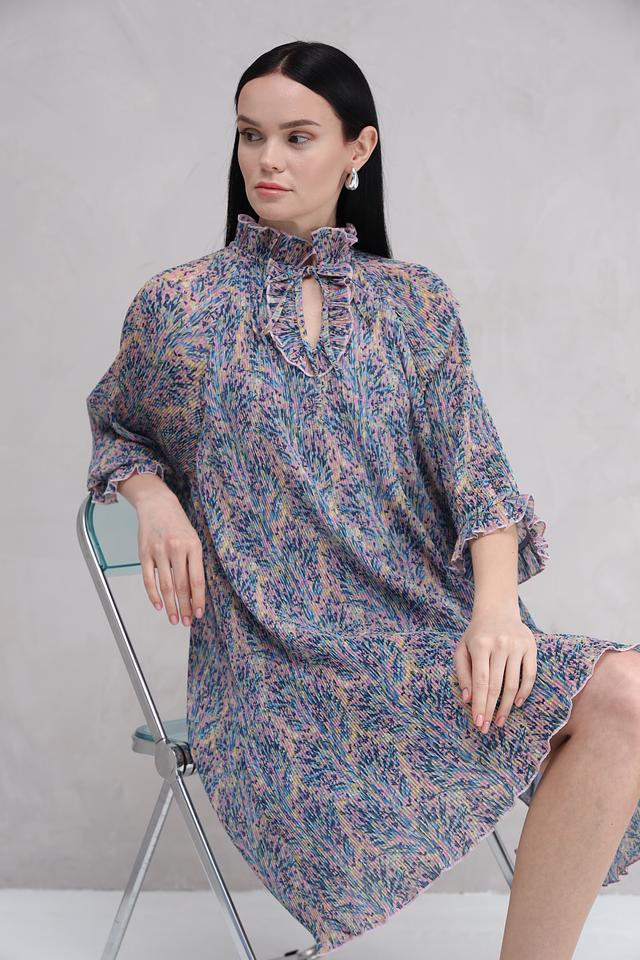 Платье имеет свободный крой, который не сковывает движений и подходит для разных типов фигур. Воротник-стойка с завязками создает элегантный акцент и позволяет регулировать вырез. Рукава 3/4 с воланами добавляют романтичности.