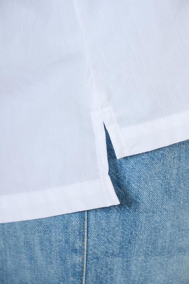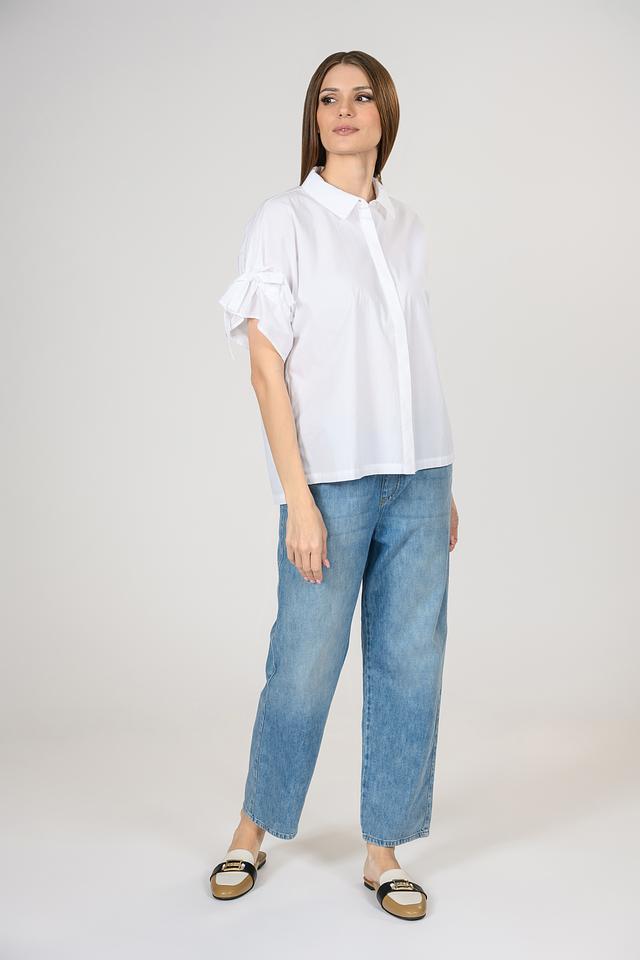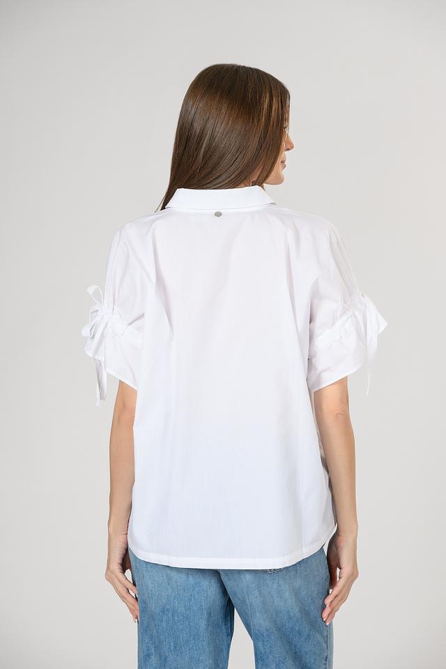 Блуза имеет прямой крой, который обеспечивает свободу движений и комфорт в течение всего дня. Короткие рукава с декоративными завязками придают блузе особый шарм и изысканность.