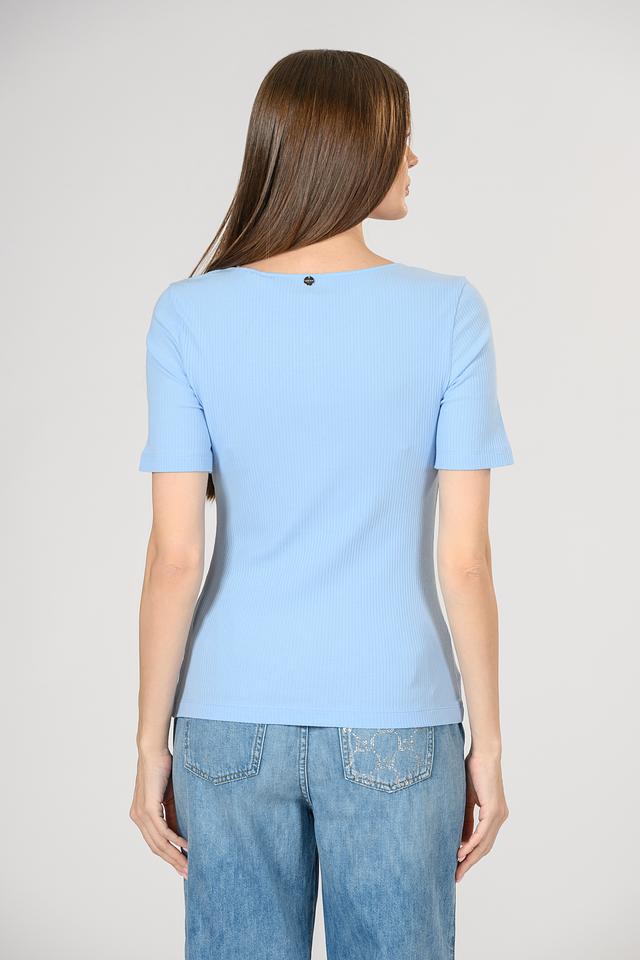 Женская футболка Rich and Royal голубого цвета выполнена из приятного в носке трикотажа в рубчик. Приталенный силуэт и округлый вырез горловины подчеркивают фигуру, а эластан в составе обеспечивает комфортную посадку. Состав: хлопок 95%, эластан 5%