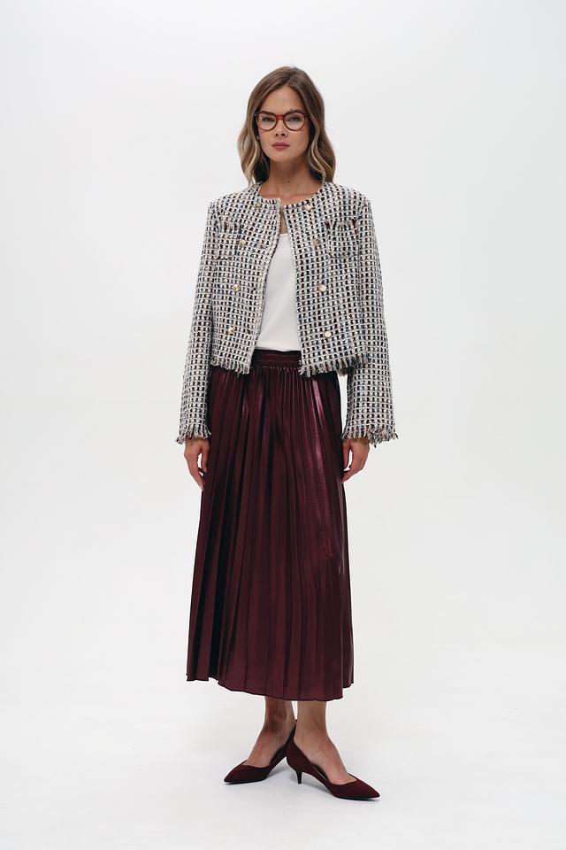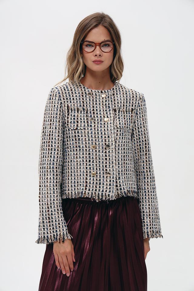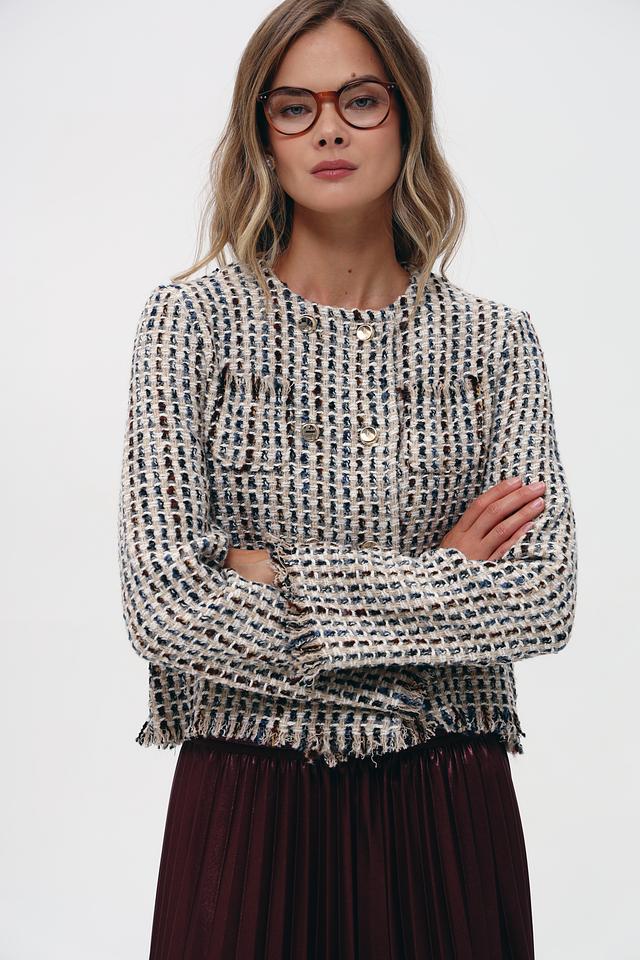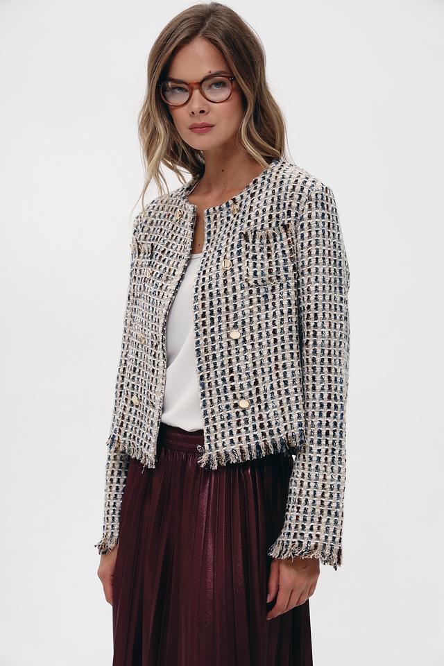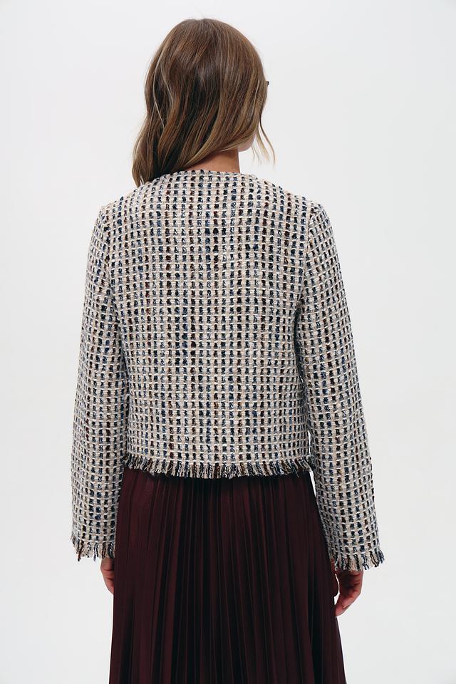 Отличительной особенностью данного жакета является отделка бахромой по краям, которая придает ему особый шарм и оригинальность. Этот жакет идеально подойдет для создания как повседневных, так и вечерних образов. Сочетайте его с юбками, брюками или платьями, чтобы создать стильный и неповторимый лук.