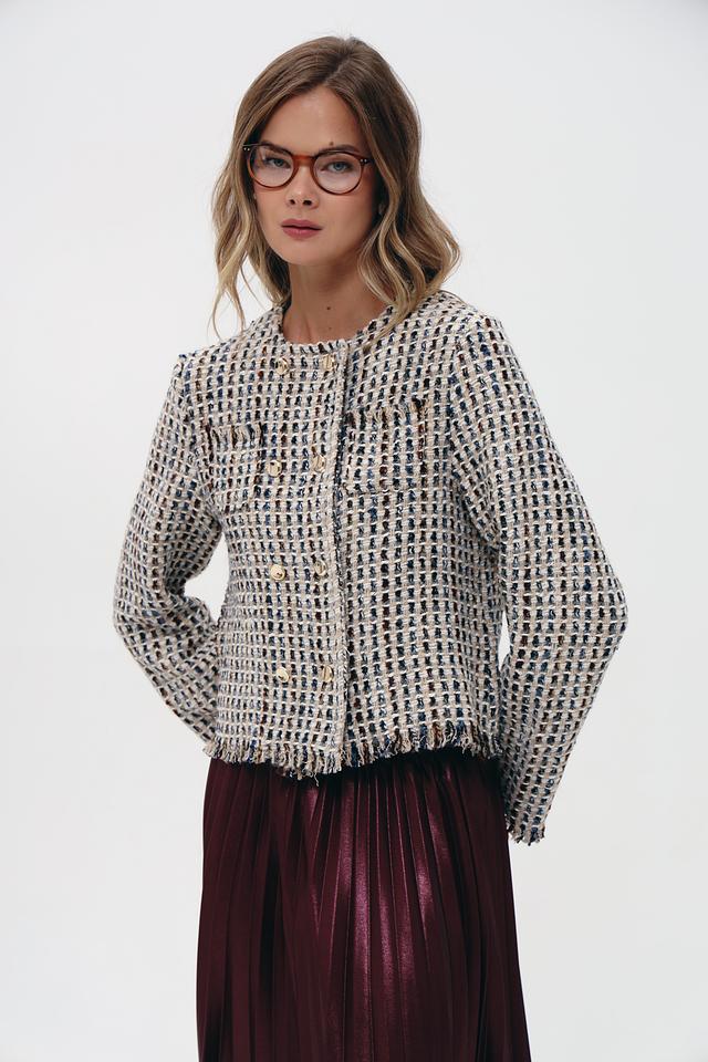 Жакет Rich and Royal бежевого цвета с классической посадкой станет стильным дополнением к вашему гардеробу. Модель выполнена в клетку с отделкой бахромой и украшена золотистыми пуговицами. Состав: хлопок 34%, полиэстер 26%, полиакрил 26%, шерсть 10%, эластан 2%, метализ.полиэстер 2%
