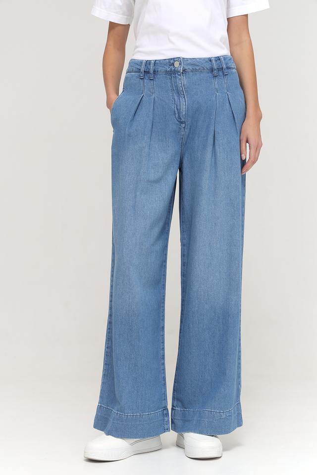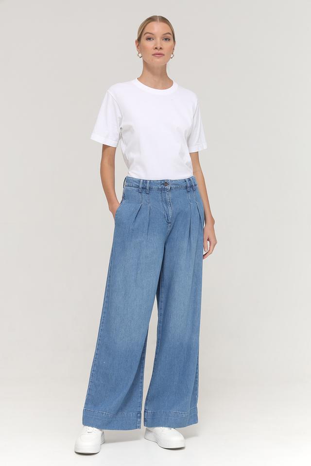 Джинсы имеют широкую штанину, которая визуально удлиняет ноги и создает элегантный силуэт. Высокая посадка подчеркивает талию и обеспечивает комфортную посадку. На поясе расположены аккуратные складки, добавляющие модели изысканности.