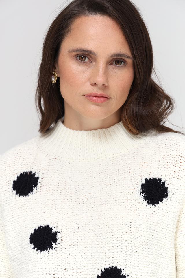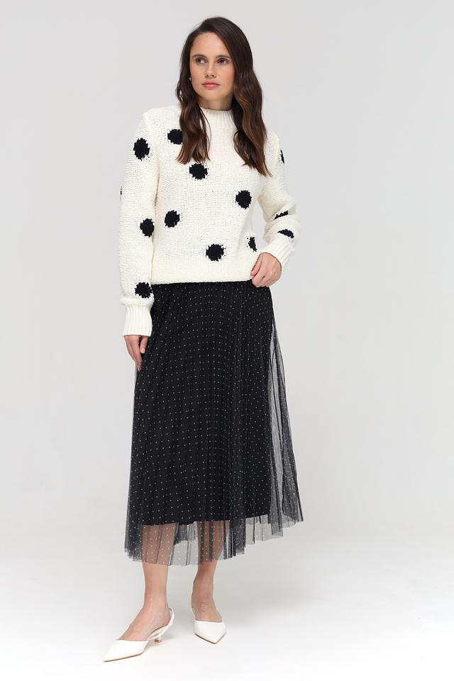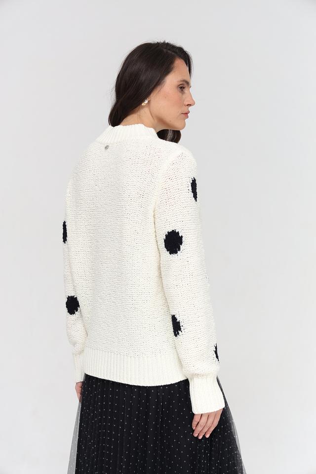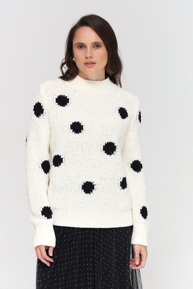Этот пуловер от Rich and Royal станет отличным дополнением к вашему гардеробу. Он выполнен в белом цвете и украшен крупным чёрным горошком, что придает ему игривый и запоминающийся вид.