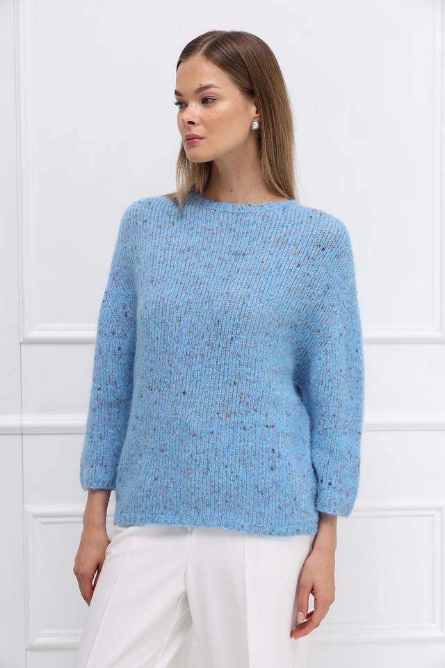 Пуловер имеет нежный голубой цвет с деликатными вкраплениями других оттенков, что придает ему особый шарм и текстуру. Округлый вырез горловины и рукава три четверти делают его универсальным для различных образов.