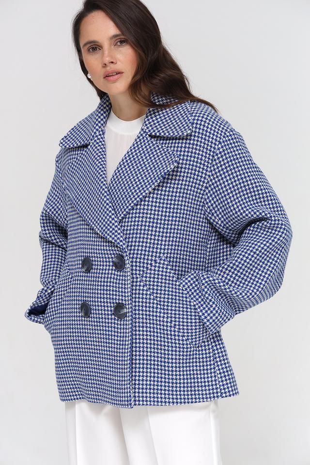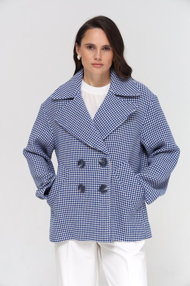 Куртка имеет двубортную застежку на крупные пуговицы, что подчеркивает ее элегантный стиль. Прямой крой обеспечивает комфортную посадку по фигуре, а слегка заниженная линия плеч создает современный силуэт.