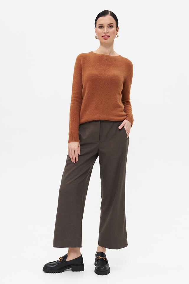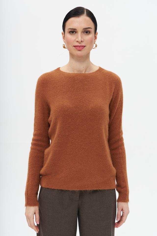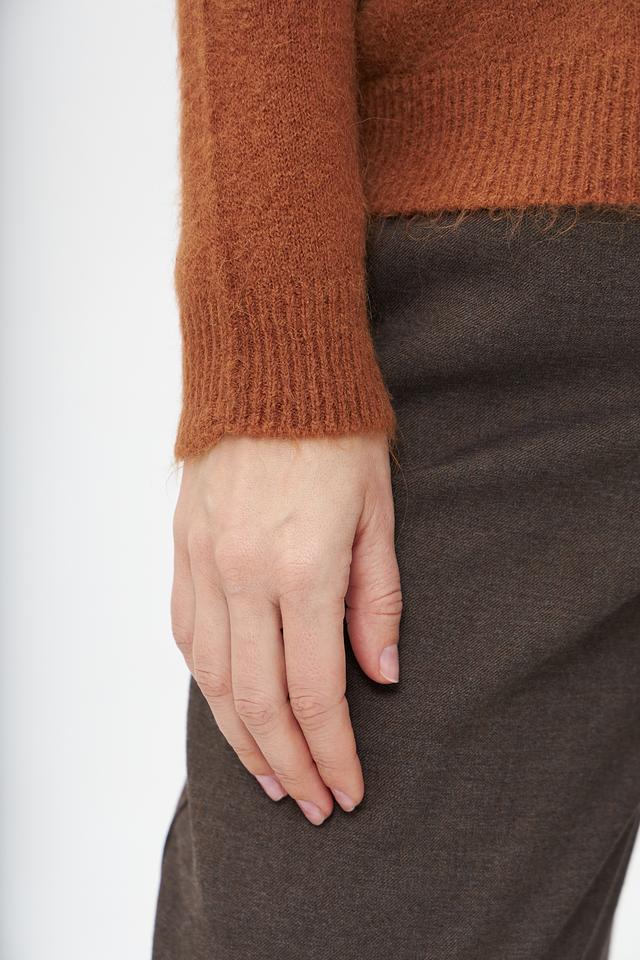 Пуловер имеет классический крой с округлым вырезом горловины, что делает его универсальным для различных стилей. Рыжий цвет придает образу яркость и индивидуальность.