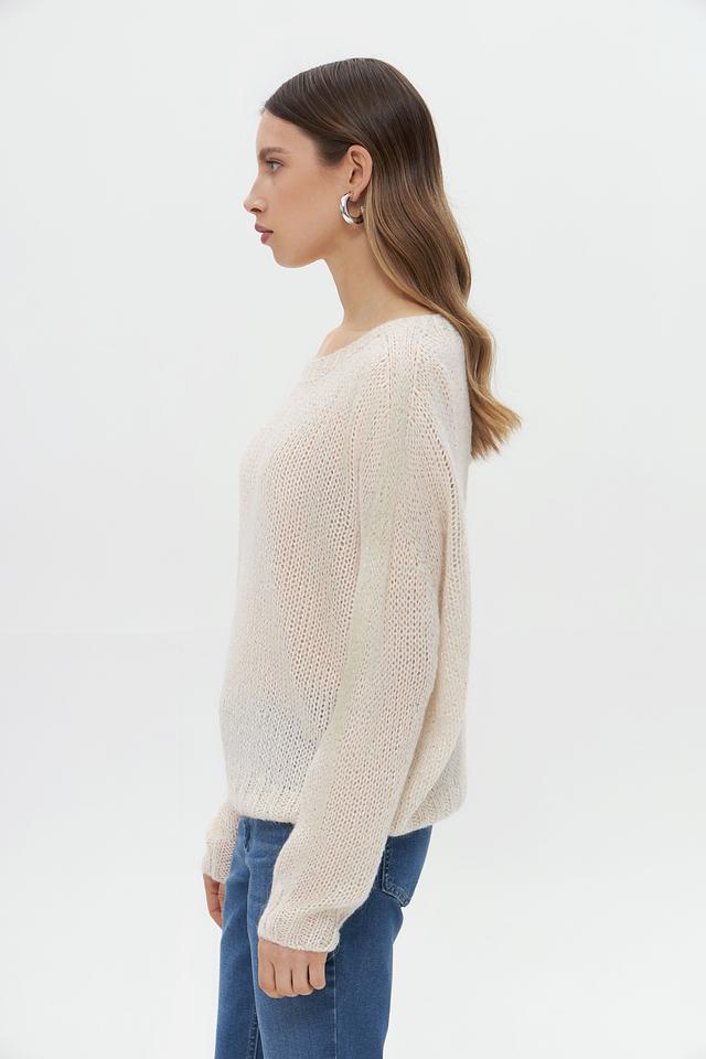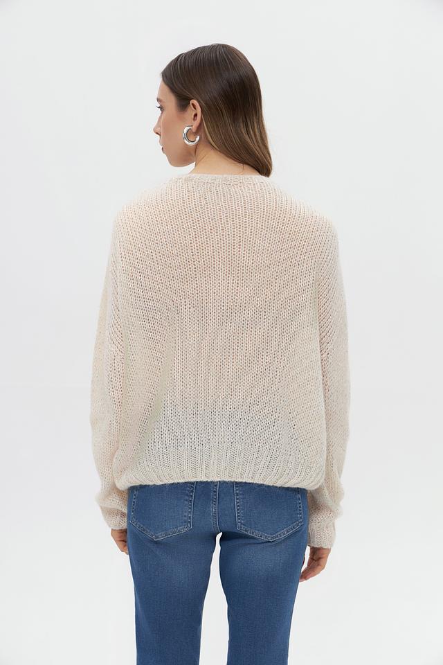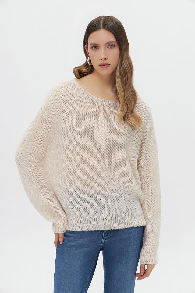Бежевый пуловер от Rich and Royal из мягкой пряжи с добавлением альпаки и шерсти. Модель свободного кроя с округлым вырезом горловины и рукавами реглан. Состав: полиэстер 44%, полиакрил 19%, полиамид 18%, альпака 14%, шерсть 3%, мохер 2%
