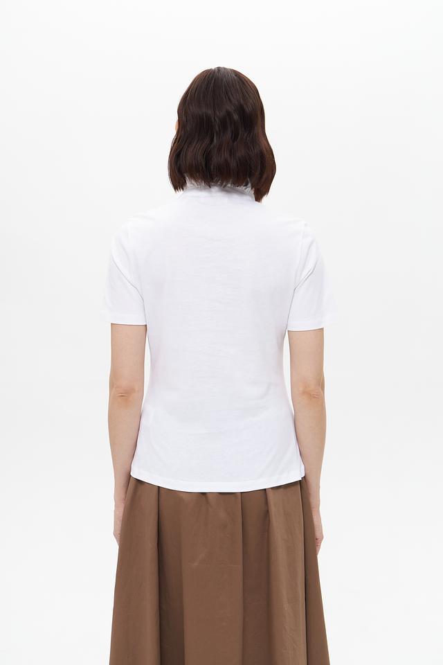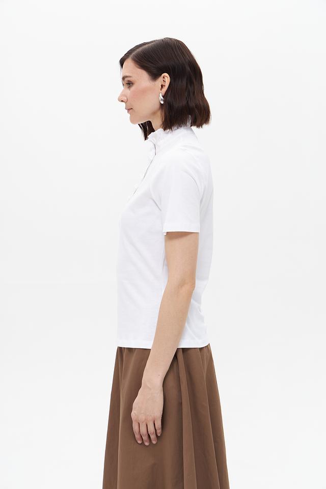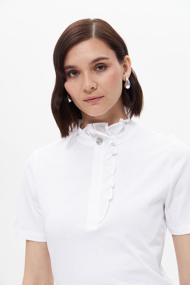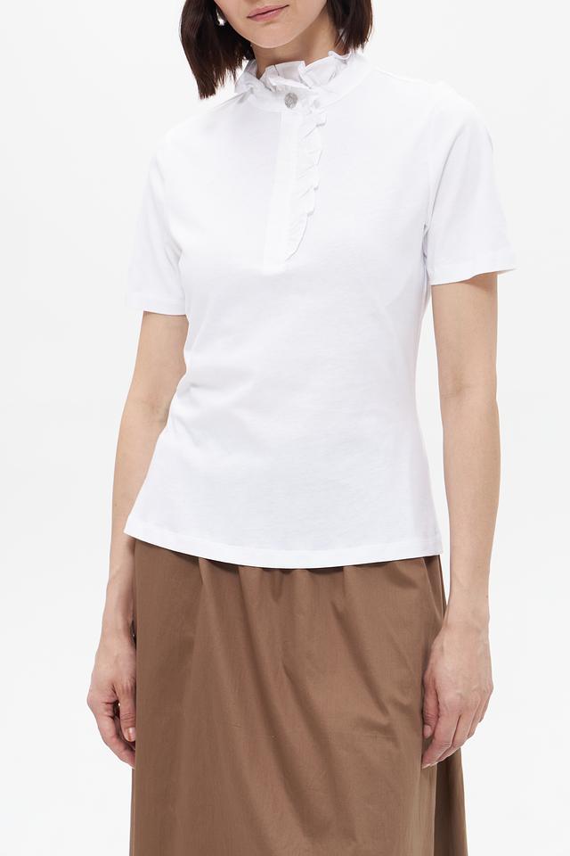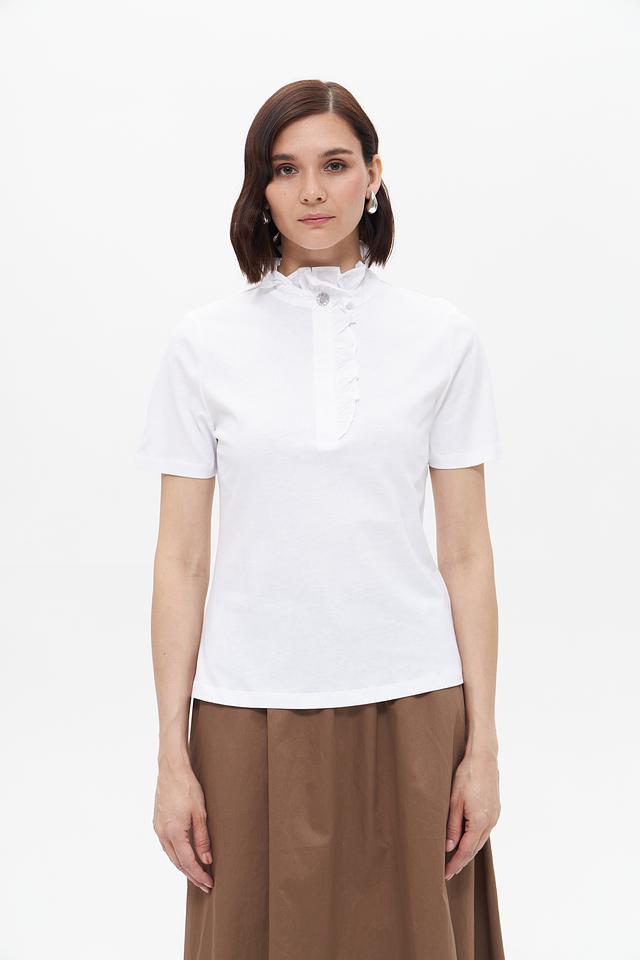 Белая блузка Rich and Royal с короткими рукавами и воротником-стойкой, украшенным рюшами. Модель выполнена из 100% хлопка, обеспечивающего комфорт и воздухопроницаемость. Состав: хлопок 100%