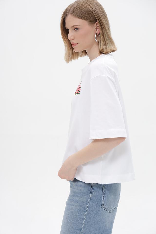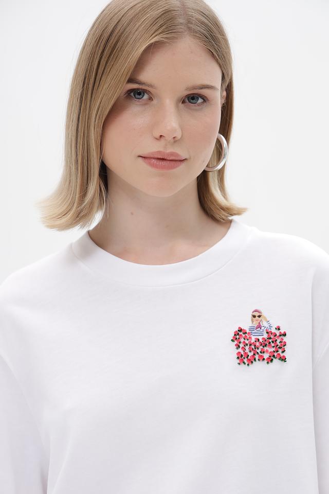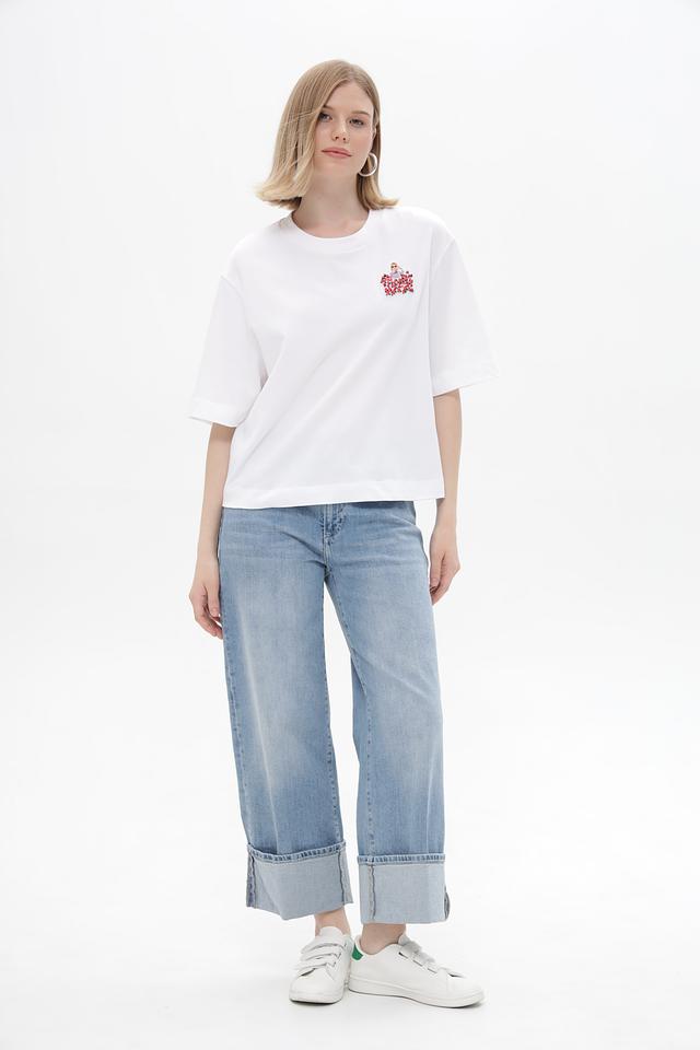 Особенностью данной модели является яркая и красочная вышивка на груди, изображающая цветочный узор. Этот декоративный элемент придает футболке индивидуальность и делает ее более привлекательной.