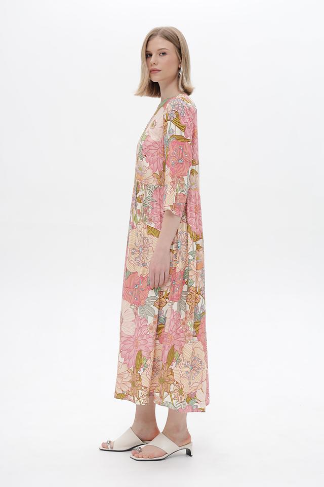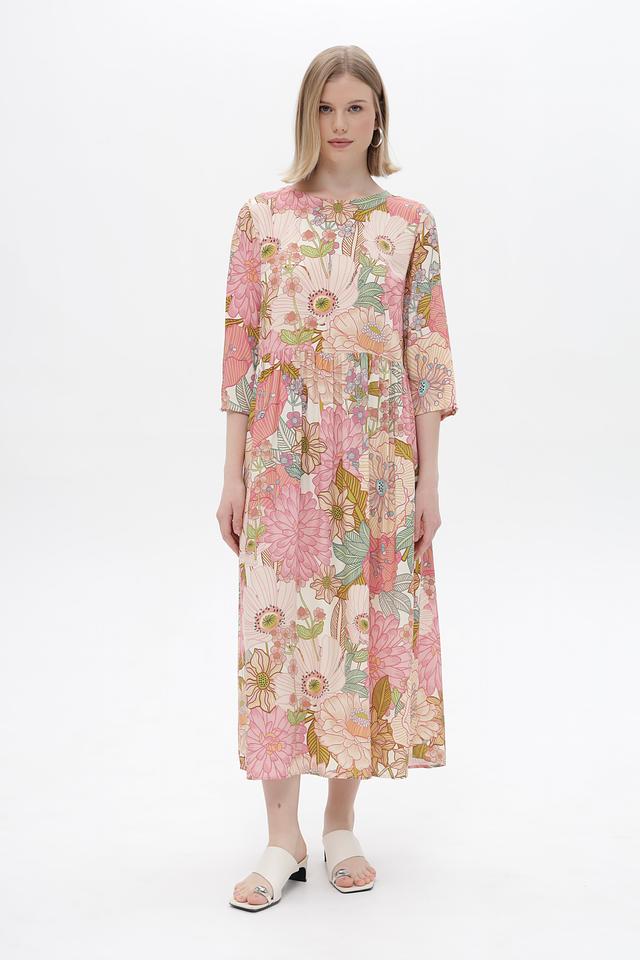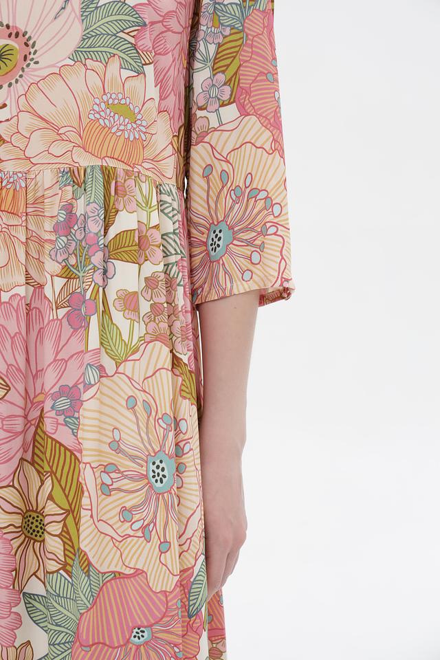 Основной цвет платья – нежно-розовый, который служит прекрасным фоном для яркого и красочного цветочного принта. Принт включает в себя различные оттенки розового, оранжевого, зеленого и голубого, создавая эффектный и запоминающийся образ.
