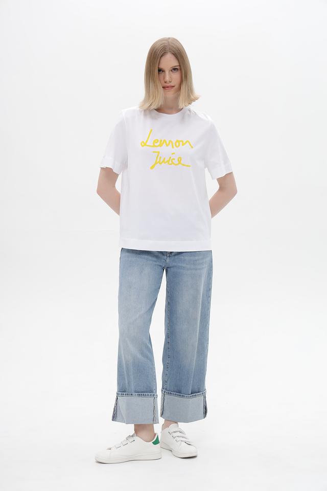 Белая футболка Rich and Royal с ярким принтом "Lemon Juice" на лицевой стороне и изображением пляжного зонтика на спине. Изготовлена из 100% хлопка, обеспечивая комфорт и воздухопроницаемость. Состав: хлопок 100%