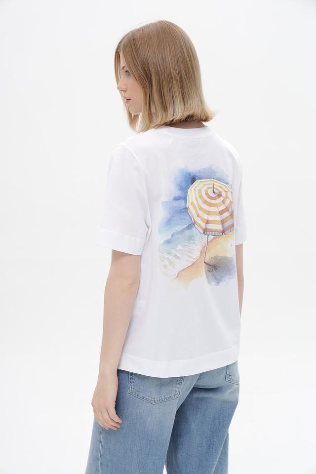 На спине футболки расположен красочный принт с изображением пляжного зонтика, создающий атмосферу отдыха и беззаботности. Модель имеет прямой крой и короткие рукава, что обеспечивает комфорт в жаркую погоду.