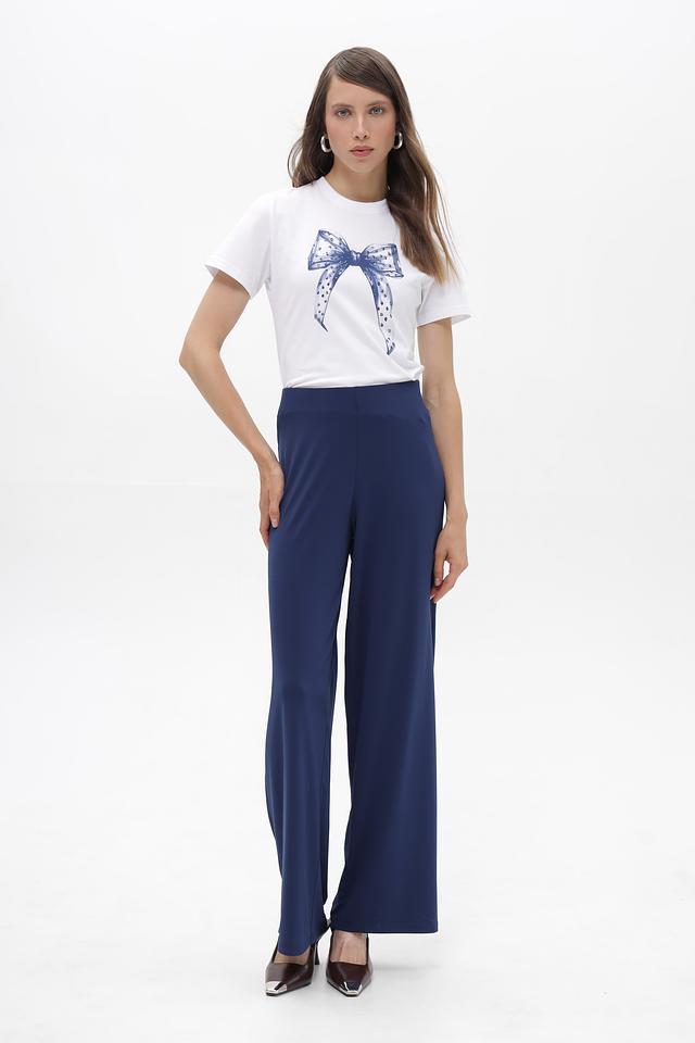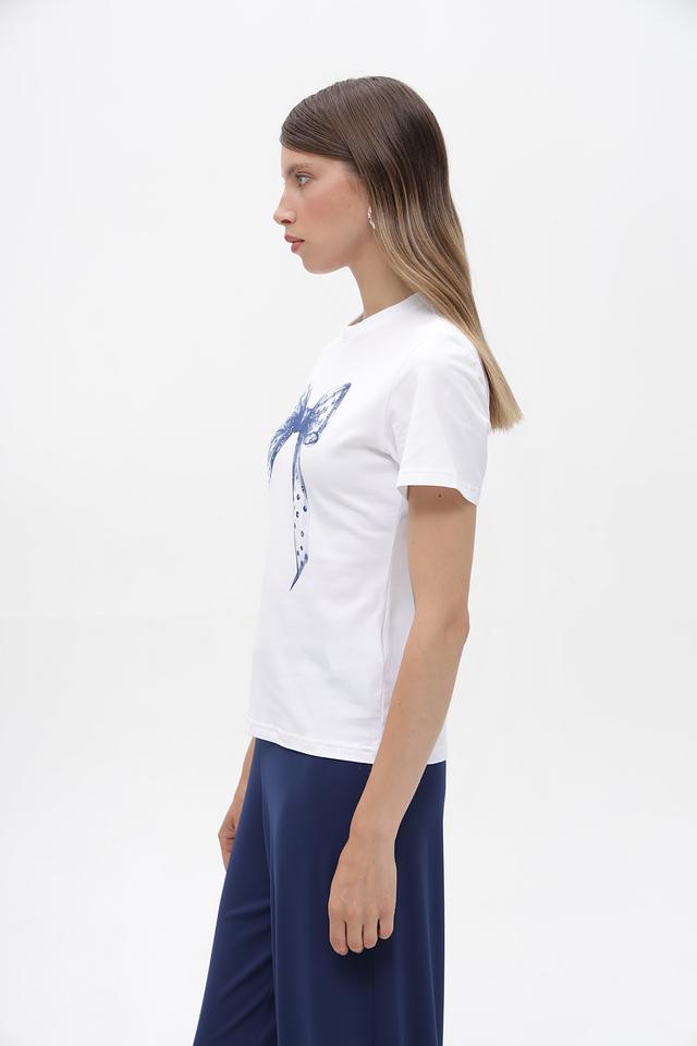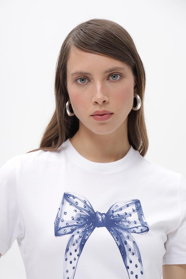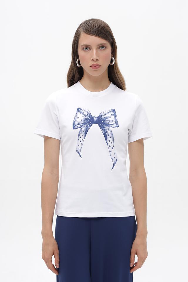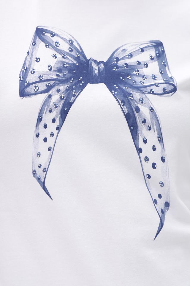 Основным элементом дизайна является принт в виде голубого банта, который добавляет образу женственности и изысканности. Футболка имеет классический прямой крой, короткие рукава и круглый вырез горловины.