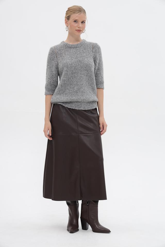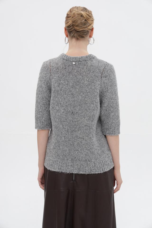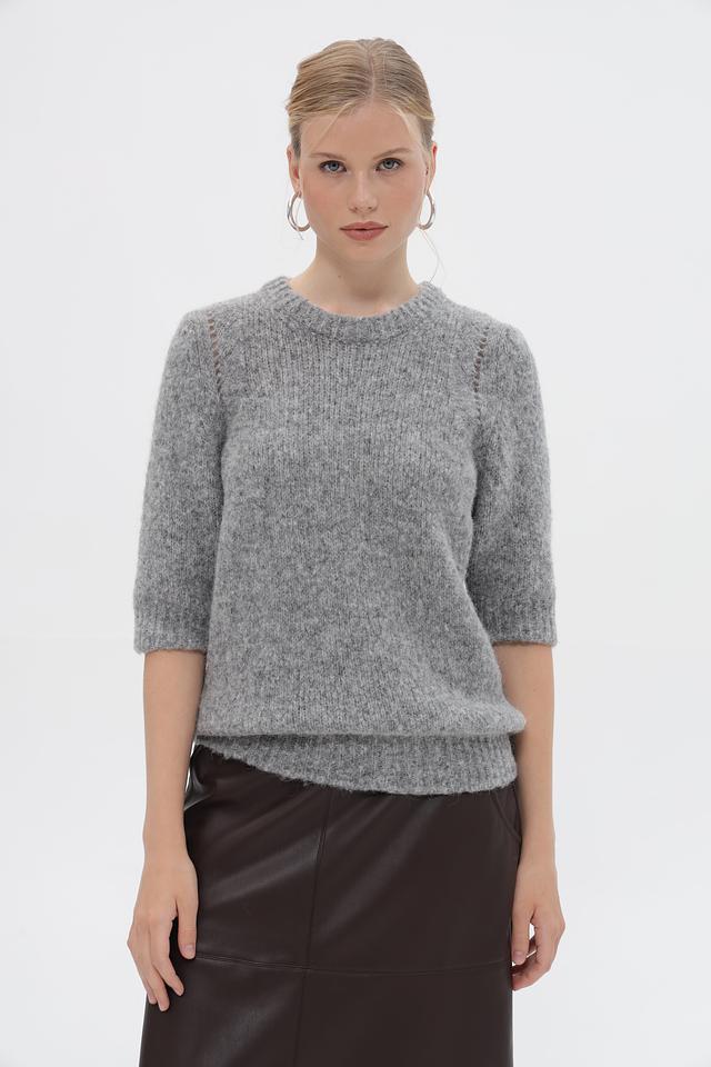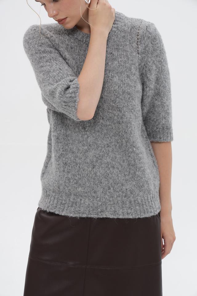 Серый пуловер от Rich and Royal из мягкой пряжи с добавлением альпаки. Модель с короткими рукавами и округлым вырезом горловины. Состав: полиамид, шерсть, альпака, акрил. Состав: акрил 32%, альпака 30%, полиамид 26%, шерсть 12%