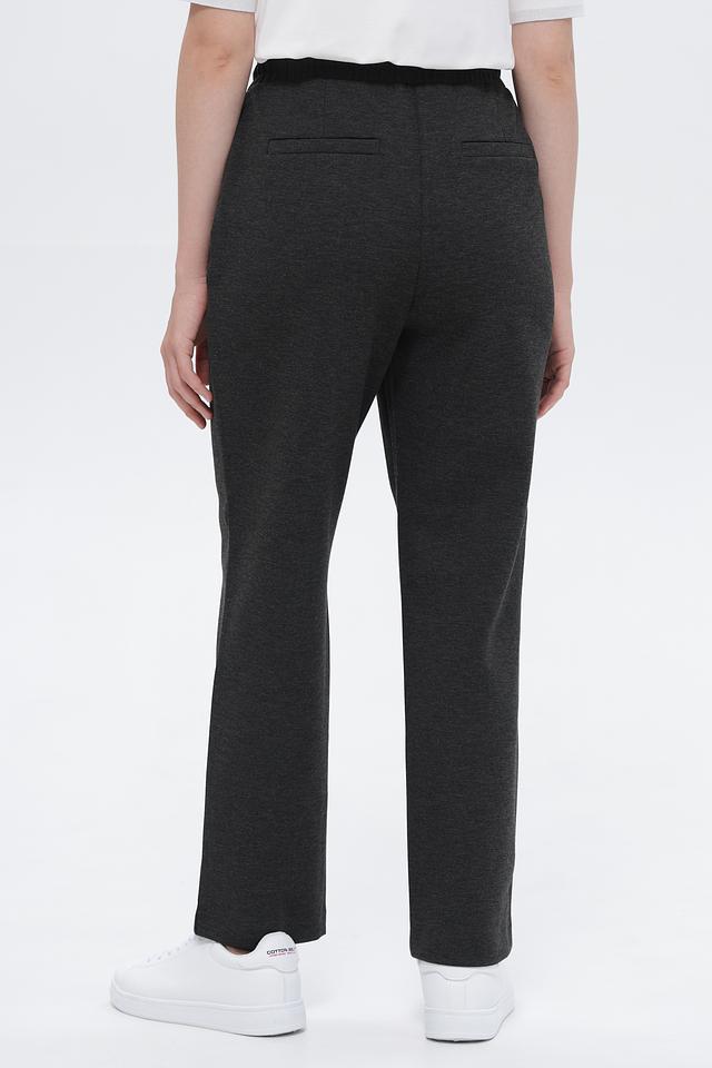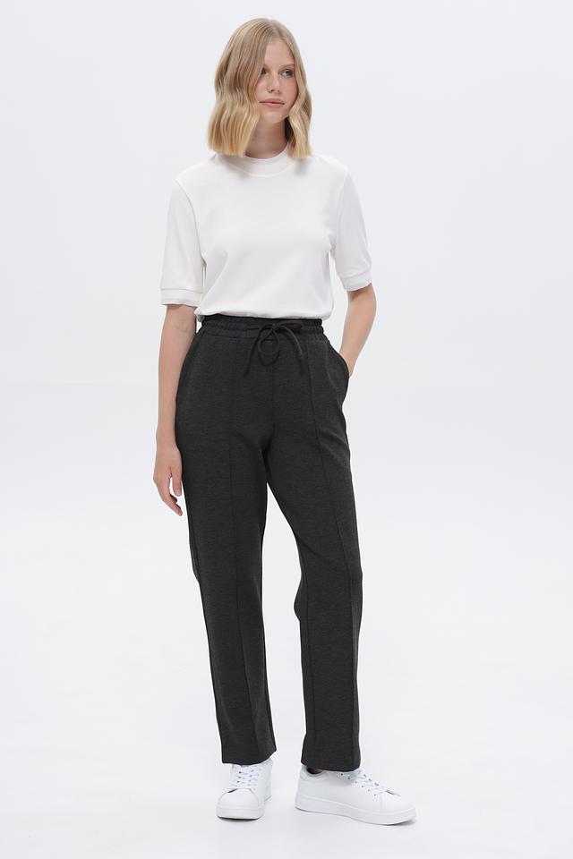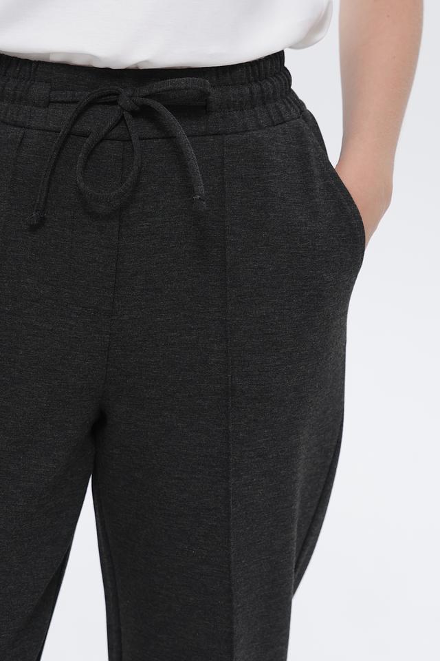 Брюки имеют классический крой с вертикальными вытачками, которые визуально удлиняют силуэт. Пояс на резинке дополнен функциональными завязками, обеспечивающими идеальную посадку по фигуре. Наличие боковых карманов делает модель практичной и удобной в повседневной носке.