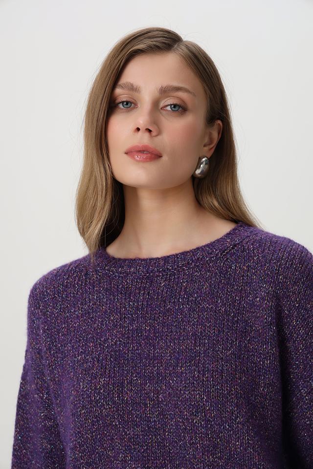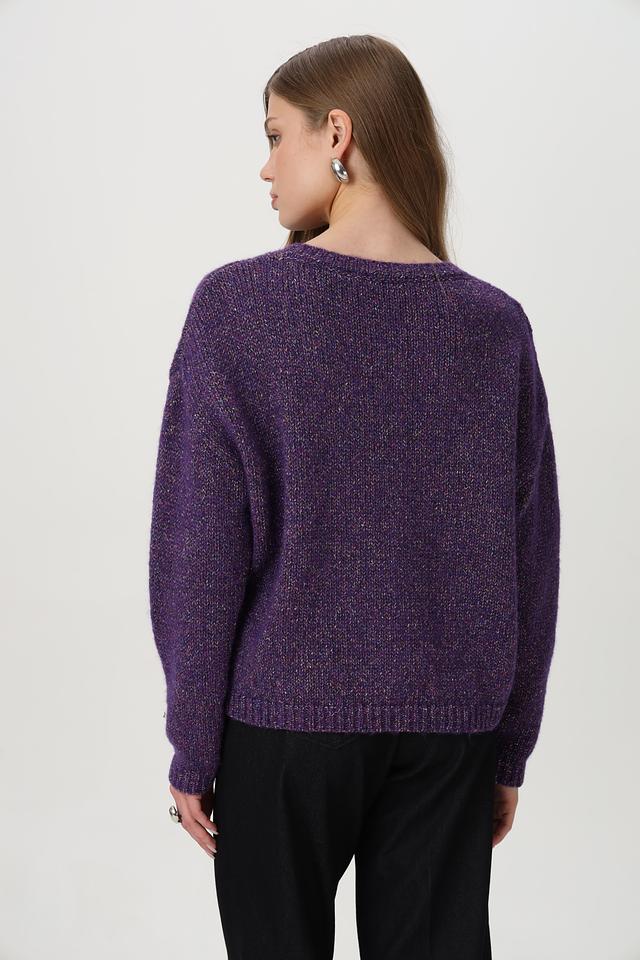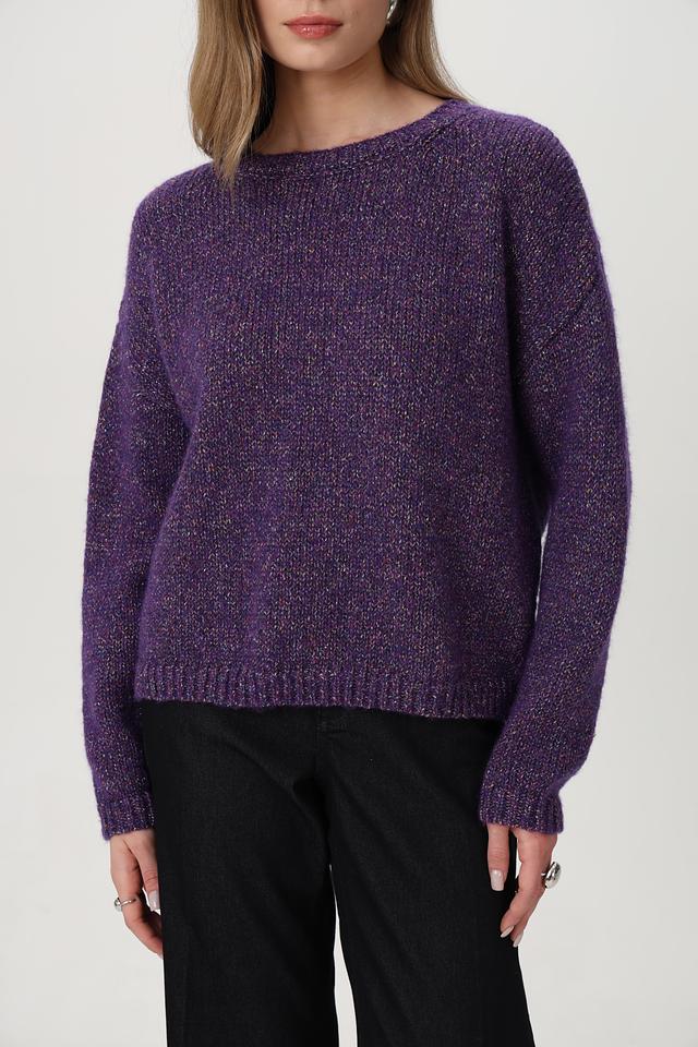 Фиолетовый пуловер от Rich and Royal из смесовой шерсти с добавлением блестящих нитей. Модель имеет округлый вырез горловины и свободный крой. Состав включает шерсть, полиэстер и полиамид. Состав: шерсть 34%, полиамид 27%, полиакрил 13%, полиэстер 10%, метализ.нить 7%, шелк 5%, хлопок 4%