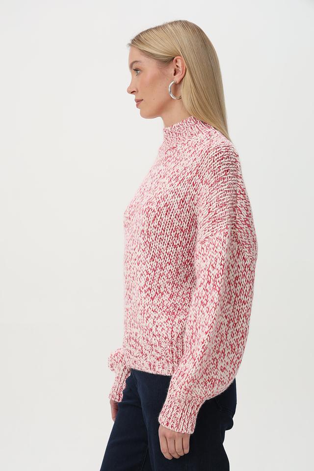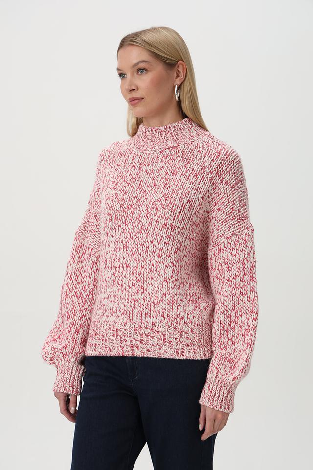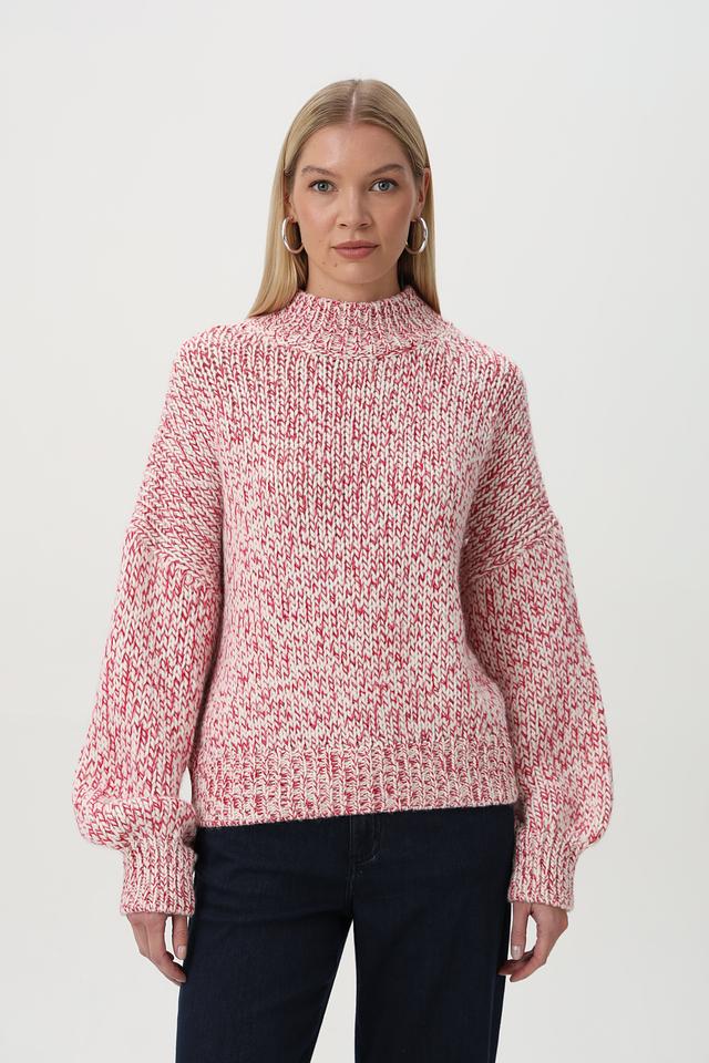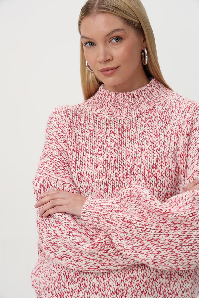 Пуловер имеет удобный крой с горловиной-водолазкой и объёмными рукавами, которые добавляют образу женственности и лёгкости. Текстура крупной вязки делает этот пуловер особенно привлекательным и интересным.