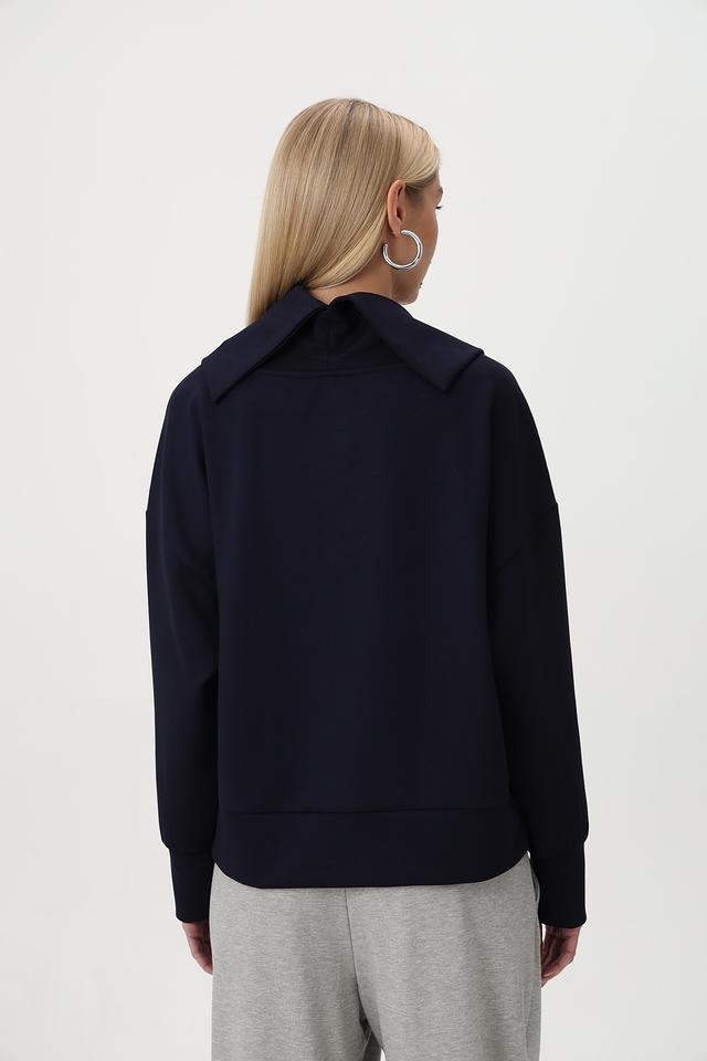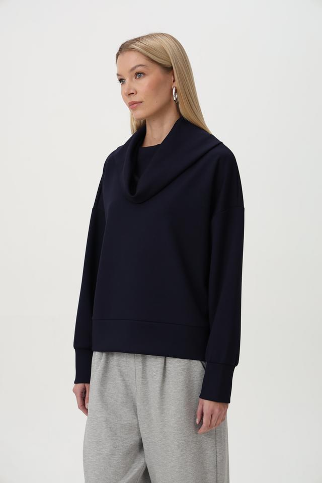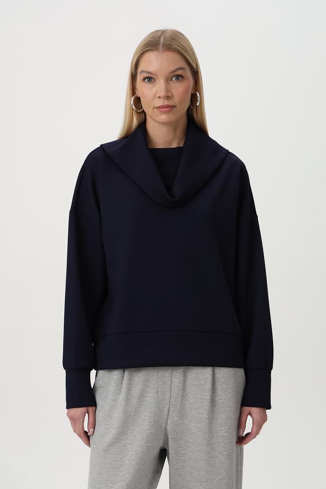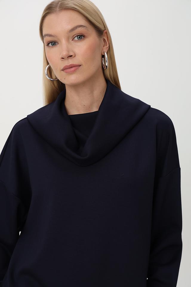 Представляем вашему вниманию стильный пуловер от бренда Rich and Royal. Модель выполнена в глубоком тёмно-синем цвете и отличается элегантным дизайном с воротником-хомутом, который придает образу изысканность.