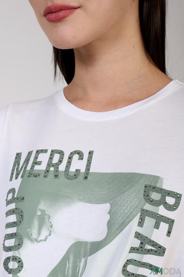 Особенностью данной модели является яркий и стильный принт "Merci Beaucoup", выполненный в зелёных тонах. Принт придает футболке индивидуальность и делает ее отличным выбором для создания повседневных образов.