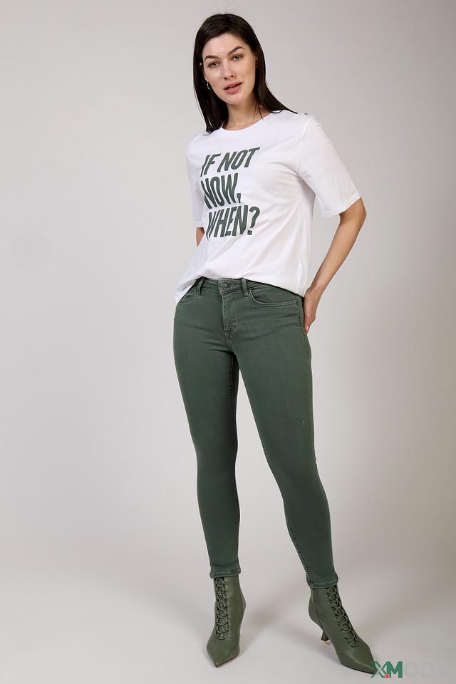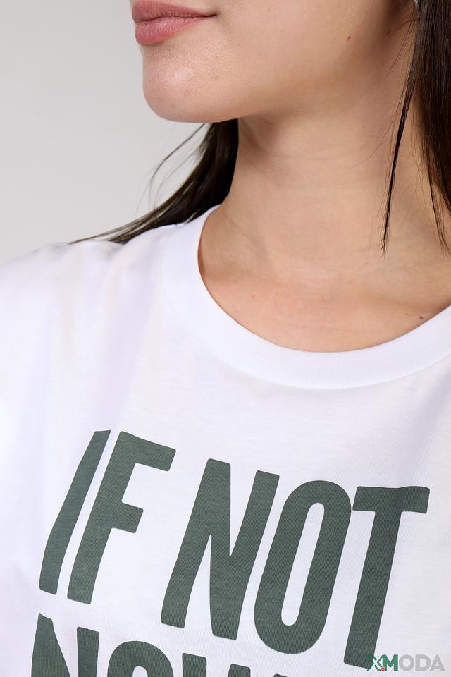 Футболка имеет прямой крой и короткие рукава, что делает её универсальной для различных образов. На передней части футболки расположен яркий принт с надписью "IF NOT NOW, WHEN?", который придаёт ей индивидуальность и стиль.