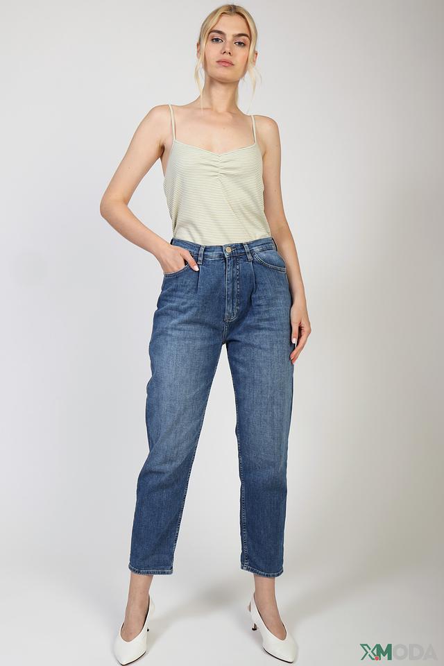 Джинсы имеют высокую посадку, подчеркивающую талию, и зауженный к низу крой, создающий современный и элегантный силуэт. Эффект состаренной ткани придает джинсам винтажный вид и делает их более интересными.