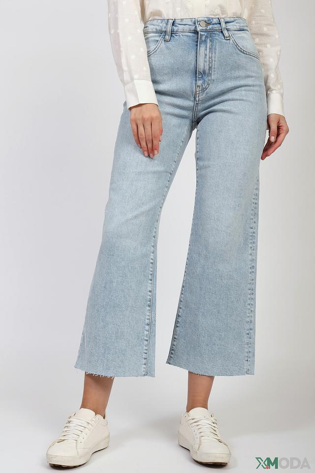 Джинсы имеют высокую посадку, которая подчеркивает талию и визуально удлиняет ноги. Клеш от колена придает образу женственность и легкость. Эффект потертости добавляет джинсам непринужденности и винтажного шарма.
