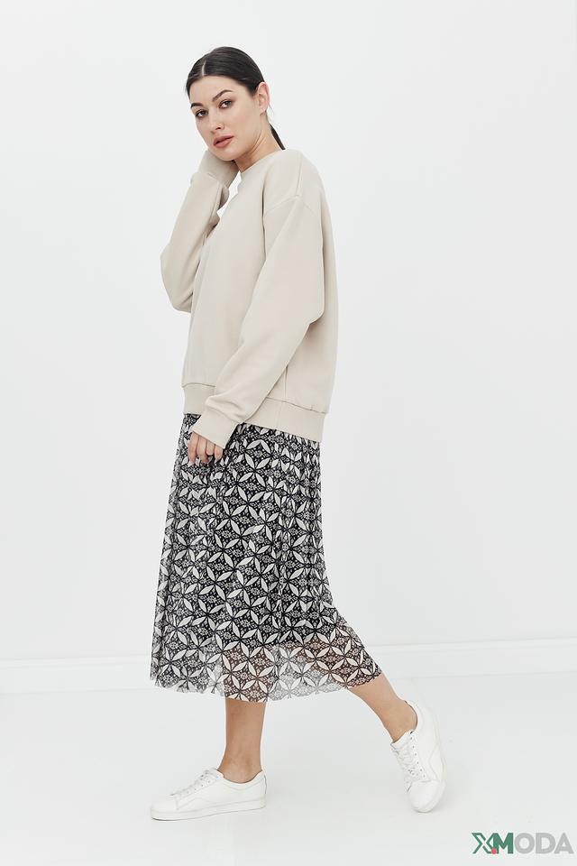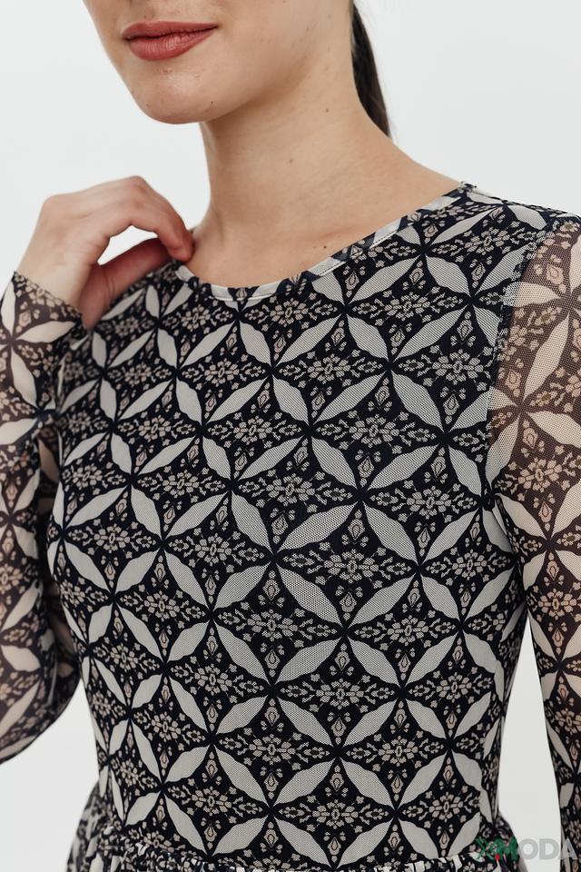 Модель имеет длину миди, длинные рукава из полупрозрачной сетки и приталенный силуэт, подчеркивающий фигуру. Юбка-солнце обеспечивает свободу движений и создает легкий, воздушный образ. Платье выполнено из высококачественного полиэстера, что гарантирует его долговечность и простоту в уходе.