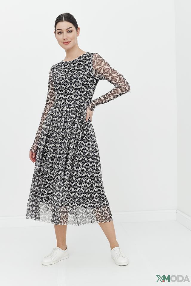 Элегантное платье Rich and Royal чёрно-белого цвета с геометрическим принтом и длинными рукавами. Модель выполнена из полиэстера и имеет приталенный силуэт с юбкой-солнце, что обеспечивает комфорт и свободу движений. Состав: полиэстер 100%, Состав_подкладка полиэстер 100%