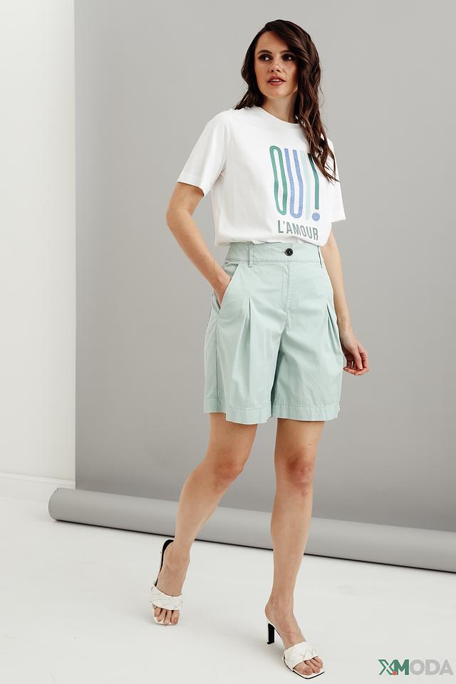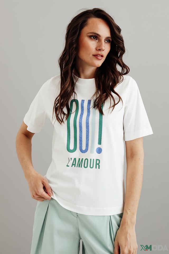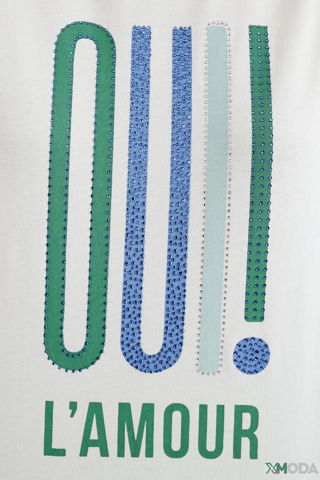 Особенностью данной модели является яркий принт "OU! L'AMOUR", выполненный в зелёных и синих тонах. Принт добавляет футболке оригинальности и привлекает внимание.