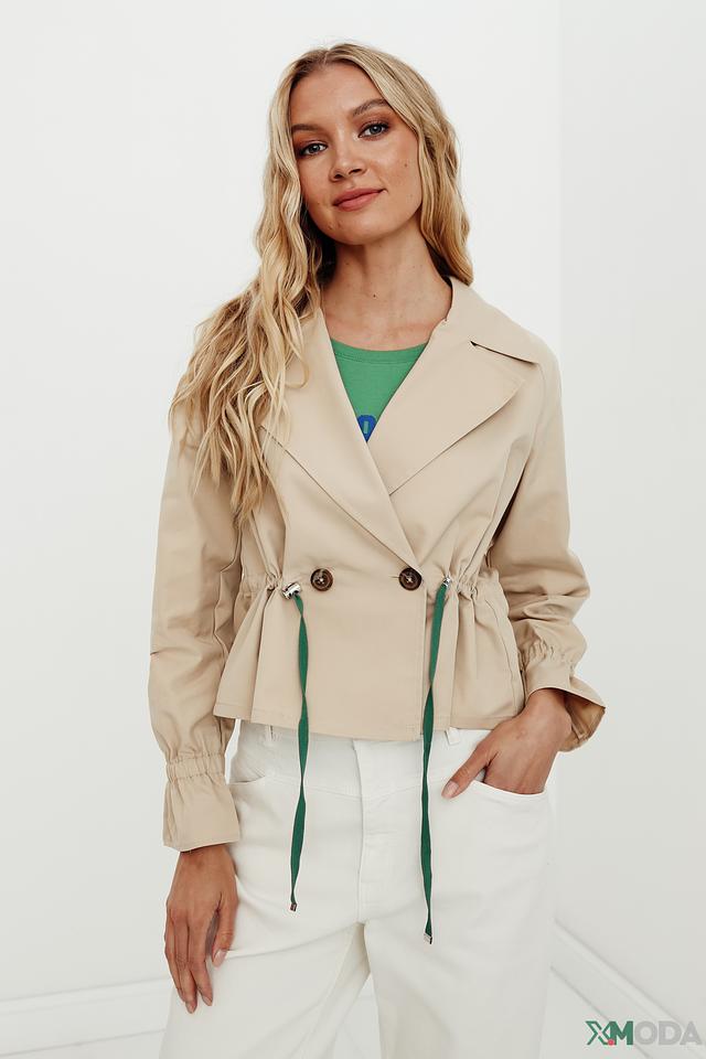 Жакет застегивается на пуговицы и дополнен декоративными шнурками на талии, которые подчеркивают фигуру. Рукава жакета имеют манжеты с завязками, что придает образу изысканность.