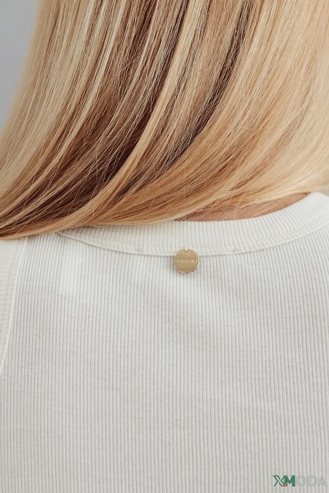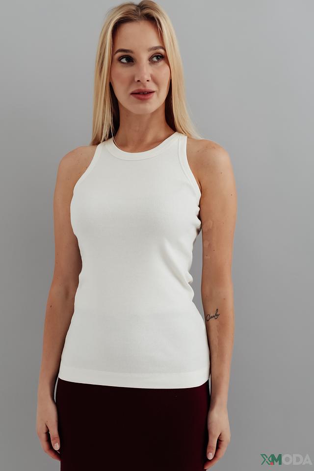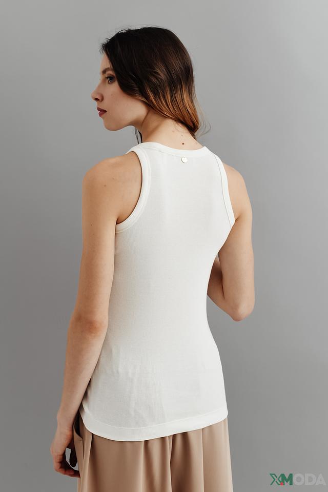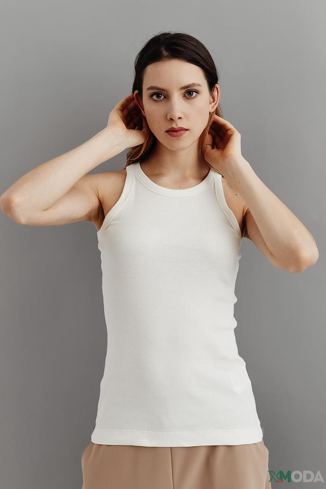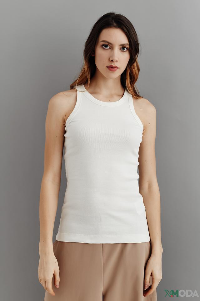 Топ имеет классический крой без рукавов и округлым вырезом горловины. Текстура ткани выполнена в виде мелкой рубрики, что придает изделию дополнительную фактурность. Благодаря нейтральному белому цвету, этот топ легко сочетается с различными элементами одежды, позволяя создавать разнообразные образы.